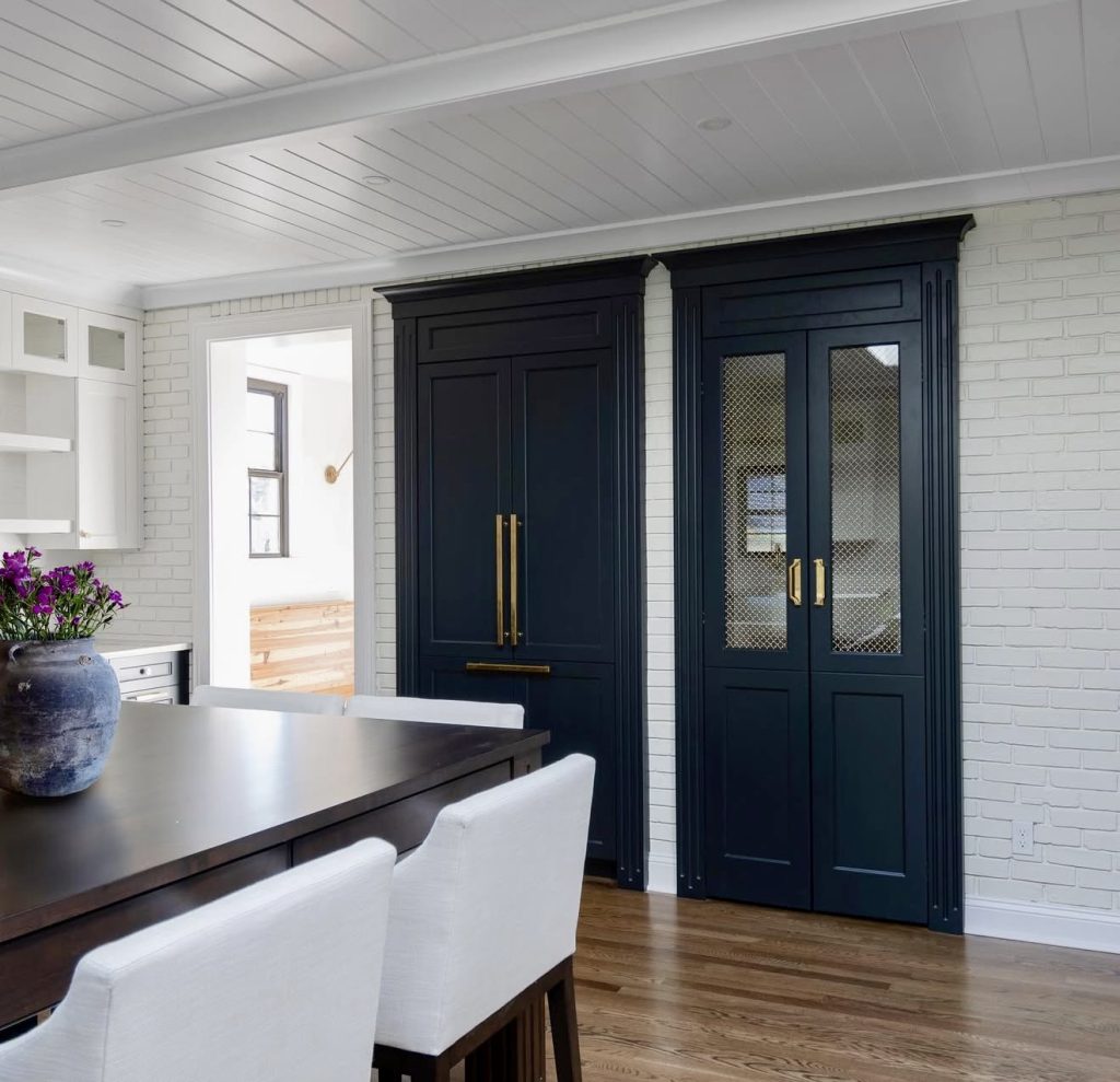 This design shows how a pantry can feel as refined as custom millwork in a historic home. The combination of deep navy and long, classic brass hardware adds a refined detail and a custom-crafted feel while also giving the double doors the control and stature of a piece of furniture. The right-hand door set contains metal mesh panels, which provide the flow and subtle filtration of vision in a way that brings purpose to the panel and keeps it from feeling like a view that was left to chance. This is a great option for style-conscious homeowners looking for a kitchen to be deeper and more dramatic without sacrificing a style that is beyond the common trends. This backdrop serves as a great fit with white brick and warm wood floors and provides a sophisticated option to custom meet the classic look of a standard bifold or sliding door.