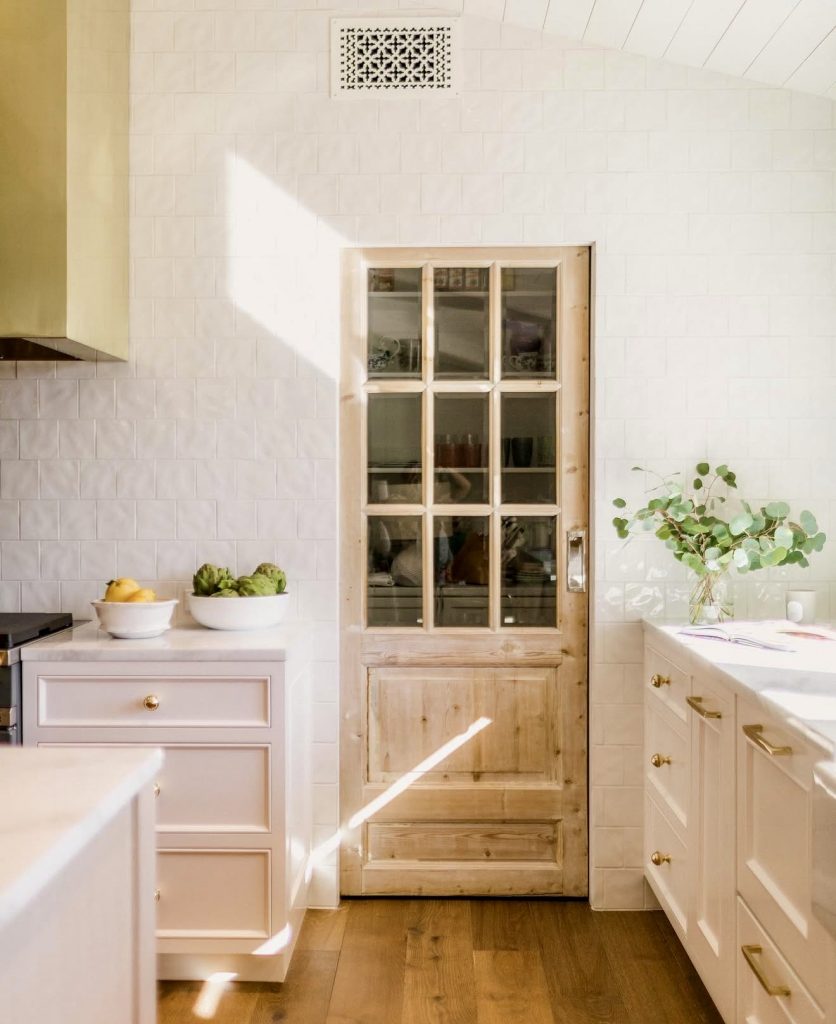This design leans into a softly aged, almost French countryside feel, where raw wood and gridded glass panels work together to bring warmth and authenticity to the space. The gently weathered finish gives the door a hand-crafted mood that feels both rustic and elegant—a balance often showcased by designers like Amber Lewis. This kind of pantry entry integrates effortlessly into lighter, neutral kitchen palettes and adds subtle architectural interest without overwhelming the cabinetry or tilework. It’s an especially appealing idea for those who appreciate understated European charm.