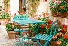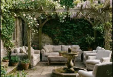 This awning that retracts is a sleek and functional element in this beautiful garden dining nook that is comfortable and cottage-style. It is not only practical but also helps you to make this place a cozy enclosure for long lunches or evening dinners under a soft canopy. This setup is ideal for a side patio or front courtyard where the coverage is needed but without the full construction of the pergola. Homeowners who want to save some money can build this with just few materials, and it can also be used in case of renting, since it provides the shade without making any changes to the permanent structure. Greenery surrounding the area gives a more tranquil and natural vibe.