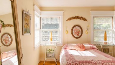 The cane bedframe, fringed pillows, and soft patterned wallpaper are the elements that frame this bedroom in old-world romance. The infusion of pink and peach hues with sage and ivory generate a rustic appearace, ideal for a vintage style room makeover. The blue nightstand and playful mix of lampshades exhibit how color and lighting can cooperate in order to evoke mood without overloading the space. It is a great mixture of boho, country, and classic — absolutely perfect for a person who wishes to have a soft, romantic room with a lot of character.