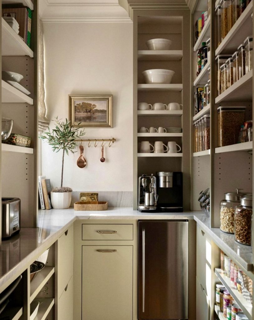 This compact pantry shows how thoughtful design ideas can make a narrow space shine. Open shelving and labeled jars create easy-to-grab organization ideas shelves, while a slim countertop provides room for a coffee maker. Subtle touches like hanging copper spoons and framed artwork add character without feeling cluttered. It’s proof that even the smallest layout can feel elevated with smart styling.