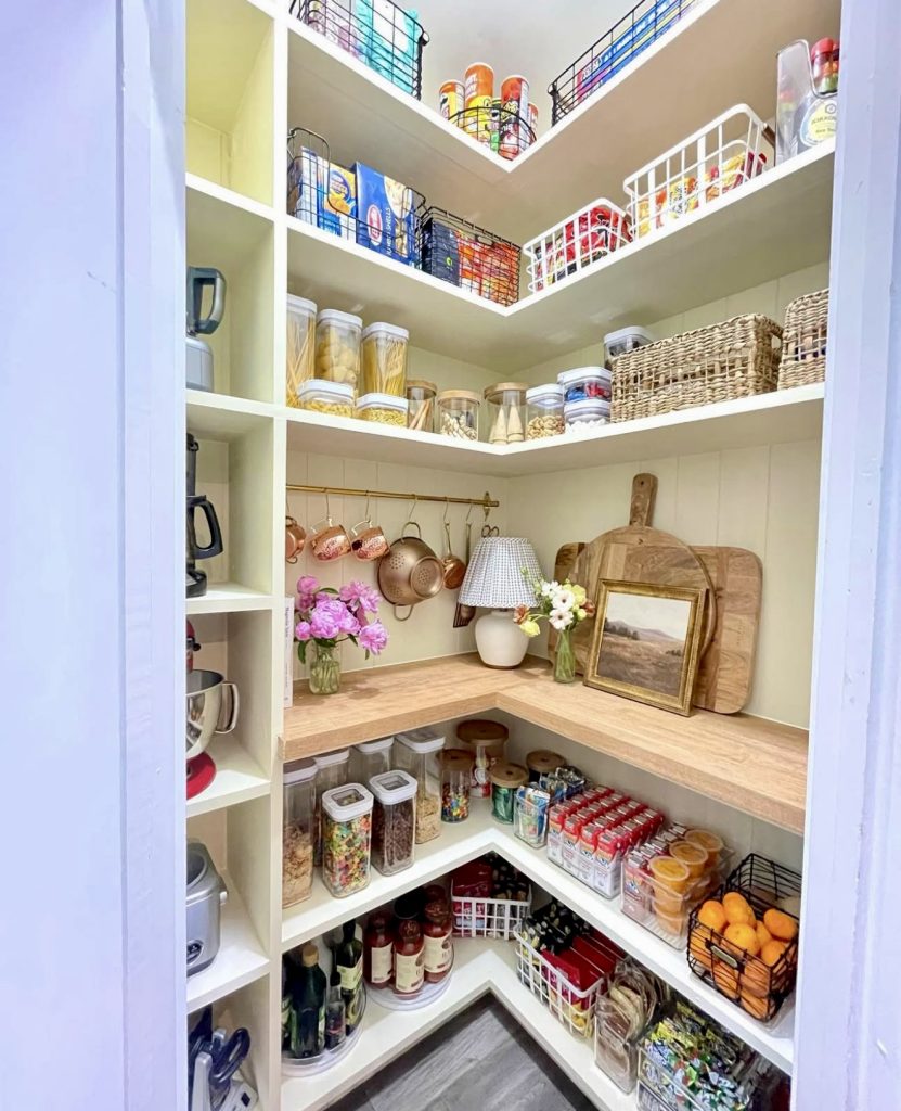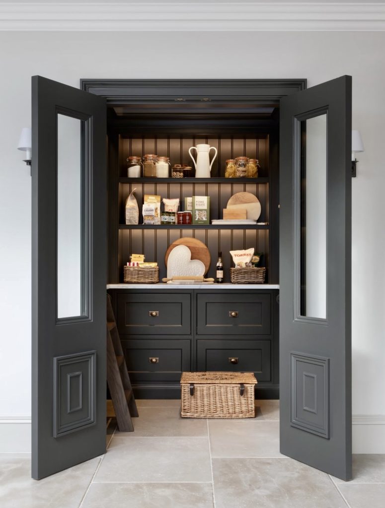This pantry embraces a rustic charm with woven baskets, a dark countertop, and shelves filled with both jars and fresh produce. The mix of open shelving ideas and closed cabinetry creates balance, while greenery and bread boards add a homely touch. It’s a reminder that organisation can look warm and lived-in, not just minimalist. This design shows how storage ideas can serve both function and beauty.