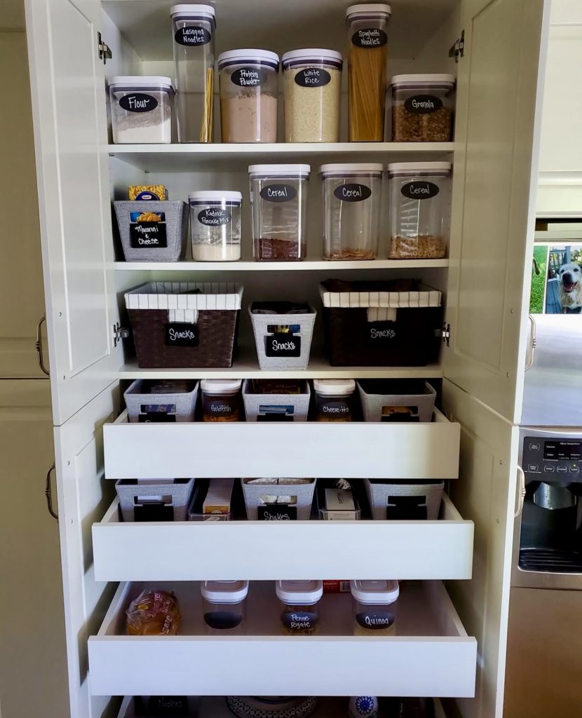 This pantry is a masterclass in organization ideas shelves with its mix of bins, labeled containers, and pull-out drawers. Each drawer is used for a specific category, keeping snacks, pasta, and grains perfectly separated. The clever design layout makes it easy to see everything at a glance without digging through clutter. It’s an ideal example of how smart closet design can maximize even a narrow space.