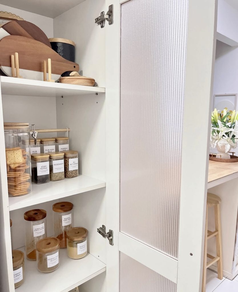 A soft and airy design defines this pantry, with frosted door ideas that add privacy while still letting in light. Glass jars with wooden lids line the shelving, making it easy to organize everyday items while maintaining a minimalist style. The space doubles as décor, with cutting boards and bowls displayed alongside pantry staples. It shows how design ideas can balance practicality with elegance.