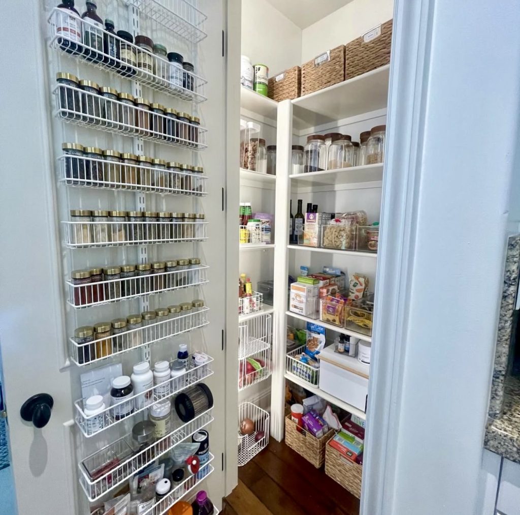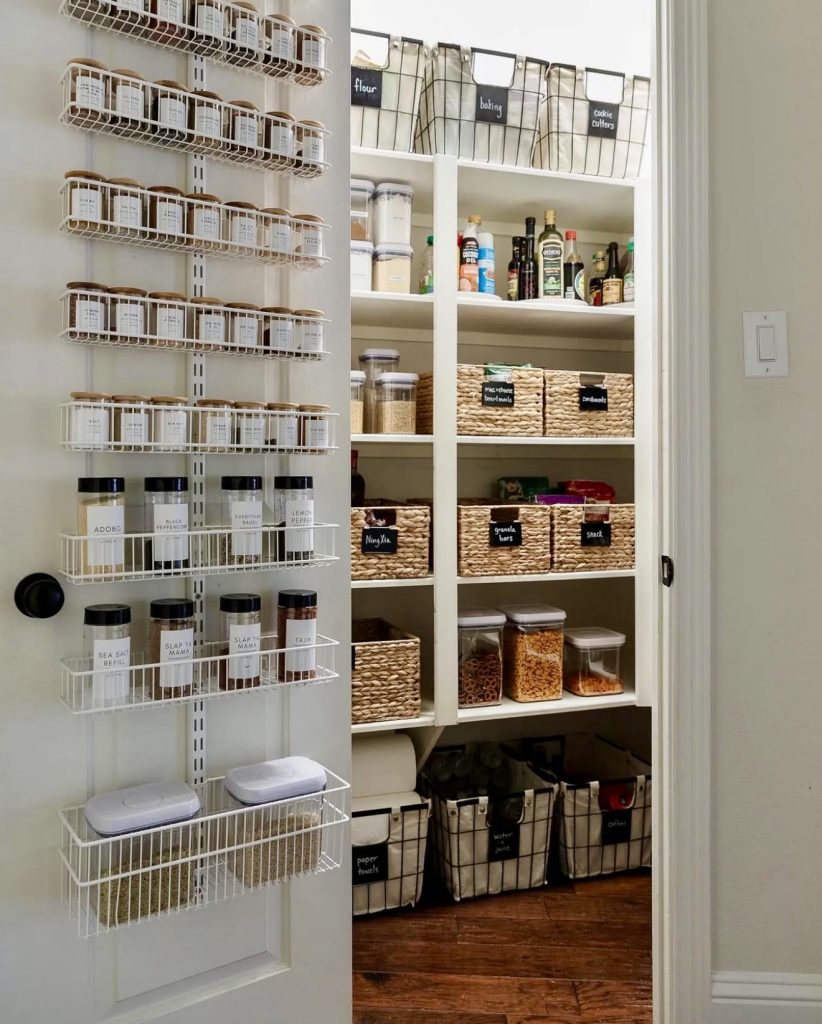 An ingenious use of door ideas transforms this pantry into a spice lover’s dream. Labeled jars neatly line the inside of the door, freeing up space on the main shelving for baskets and dry goods. The result is a tidy closet shelving idea that turns overlooked areas into valuable storage. For anyone considering a makeover diy, this is a budget-friendly trick that instantly upgrades a pantry.