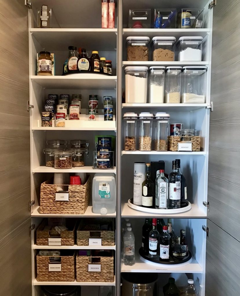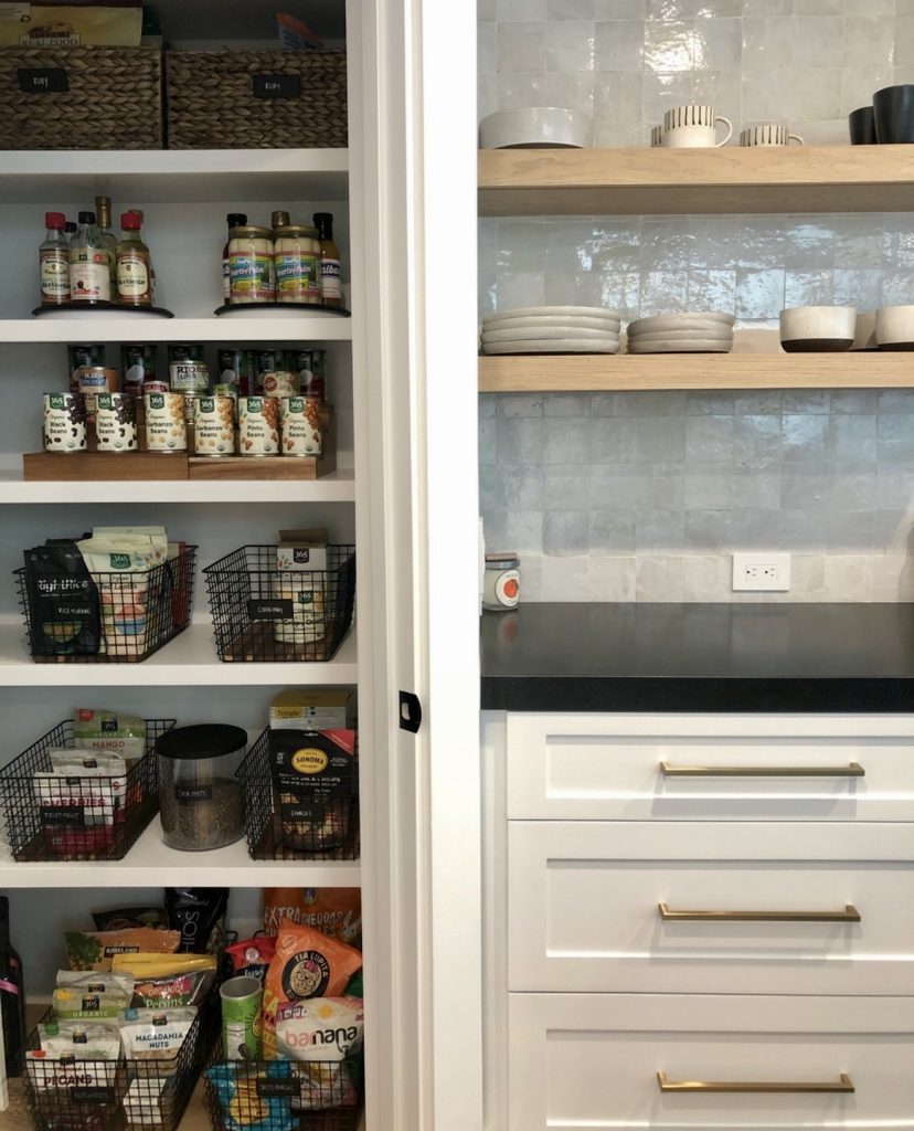 Tall closet shelving ideas are paired here with woven baskets and labeled jars for a warm and functional look. Rotating trays keep bottles of sauces and drinks accessible, while dry goods are neatly arranged in clear bins. The organization is both practical and beautiful, turning an everyday closet into a styled feature. This is a great reminder that remodel ideas don’t need to be complicated to be successful.
