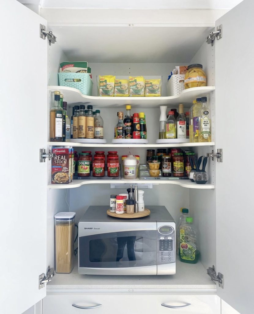 This small room shows how a pantry can double as an appliance hub. A microwave sits at counter height while shelves above hold sauces, oils, and packaged goods. Lazy Susans add another layer of organization ideas, keeping condiments within reach. It’s a simple ideas closet design that works wonderfully in any home where space is a premium.