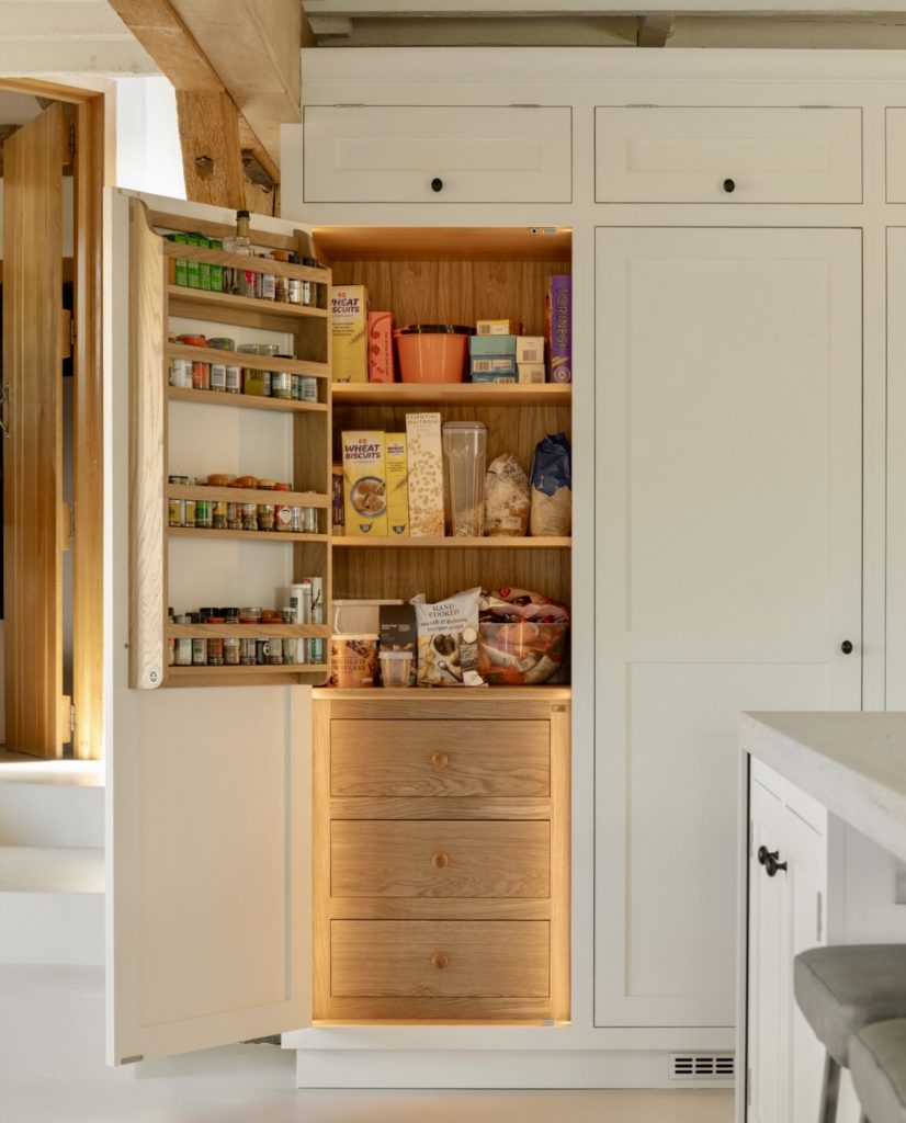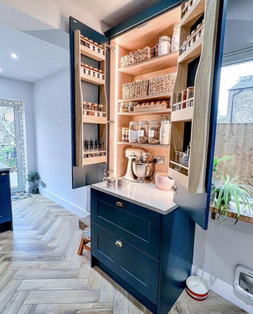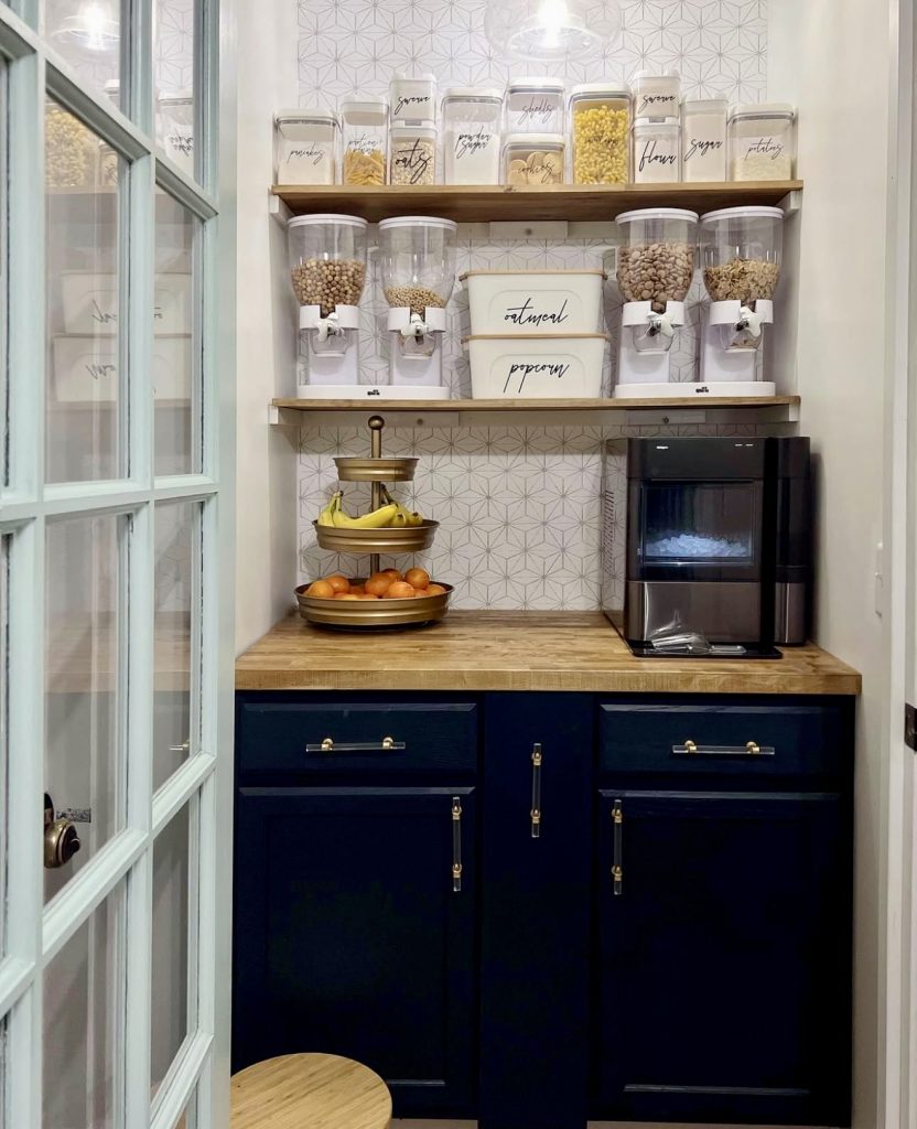 This pantry balances function and style with cereal dispensers, labeled containers, and a natural wood countertop. The navy lower cabinets add depth, while glass-front door ideas let the space feel open and bright. It’s a clever design layout that keeps breakfast essentials at arm’s reach while still looking polished. For small spaces, built-in dispensers are a brilliant organisation solution.