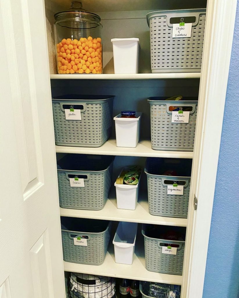 Here, a set of matching gray bins proves that uniform storage instantly elevates a pantry. Each bin is labeled, showing how organization ideas shelves can simplify meal prep and keep every category separate. The clean layout makes it easy to grab what you need without searching through clutter. This is a simple makeover diy that anyone can achieve on a budget.