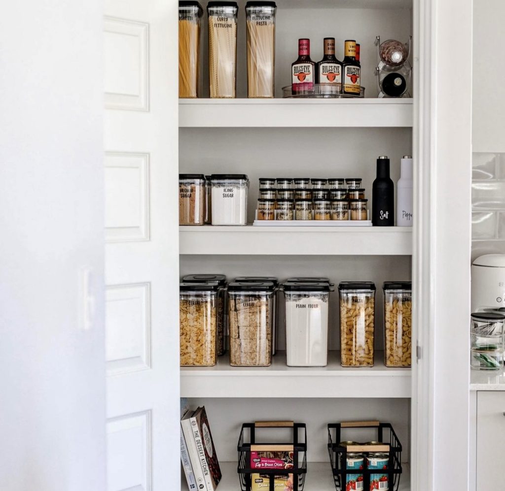 A crisp black-and-white palette defines this modern pantry, where clear containers line open shelving in perfect rows. Spices sit neatly on turntables, creating a practical yet attractive closet shelving idea. The bold contrast of black lids against white shelves gives the space a polished designer feel. This shows how small remodel ideas can make a pantry both stylish and functional.