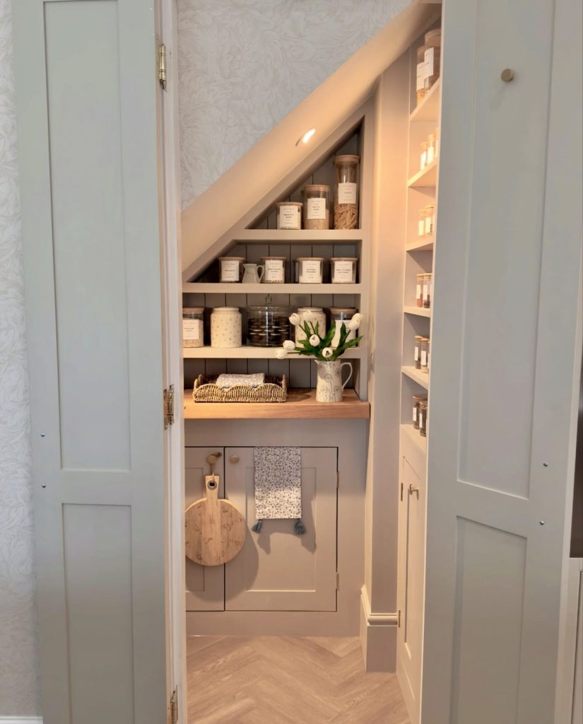 This pantry transforms an awkward spot under the stairs into a cozy and efficient storage nook. Sloped shelving ideas hold labeled jars and containers, while a warm wood countertop makes the space practical for food prep. Built-in lighting and cabinetry add elegance, turning unused space into a statement. It’s a perfect example of how smart ideas layout can bring life to overlooked corners of the home.