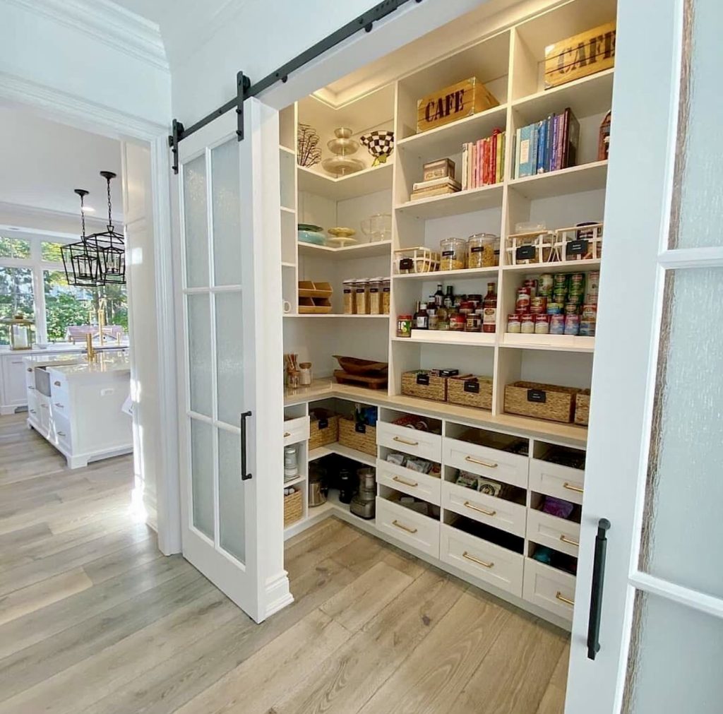 Sliding barn doors open to reveal a bright and airy closet design that feels like an extension of the kitchen. Rows of baskets and labeled jars keep everything organized, proving that style and organization go hand in hand. White cabinetry with brass handles lends a fresh and timeless appeal that works in just about any room. This is a brilliant instance of closet shelving concepts being used as décor.