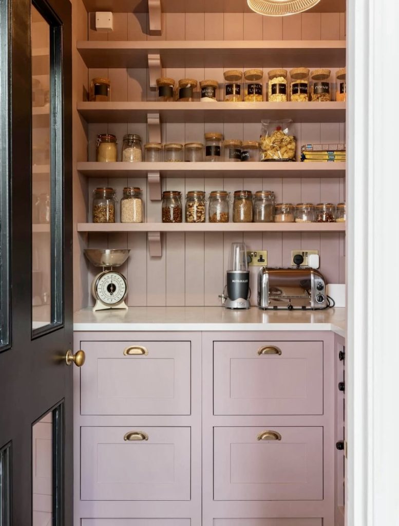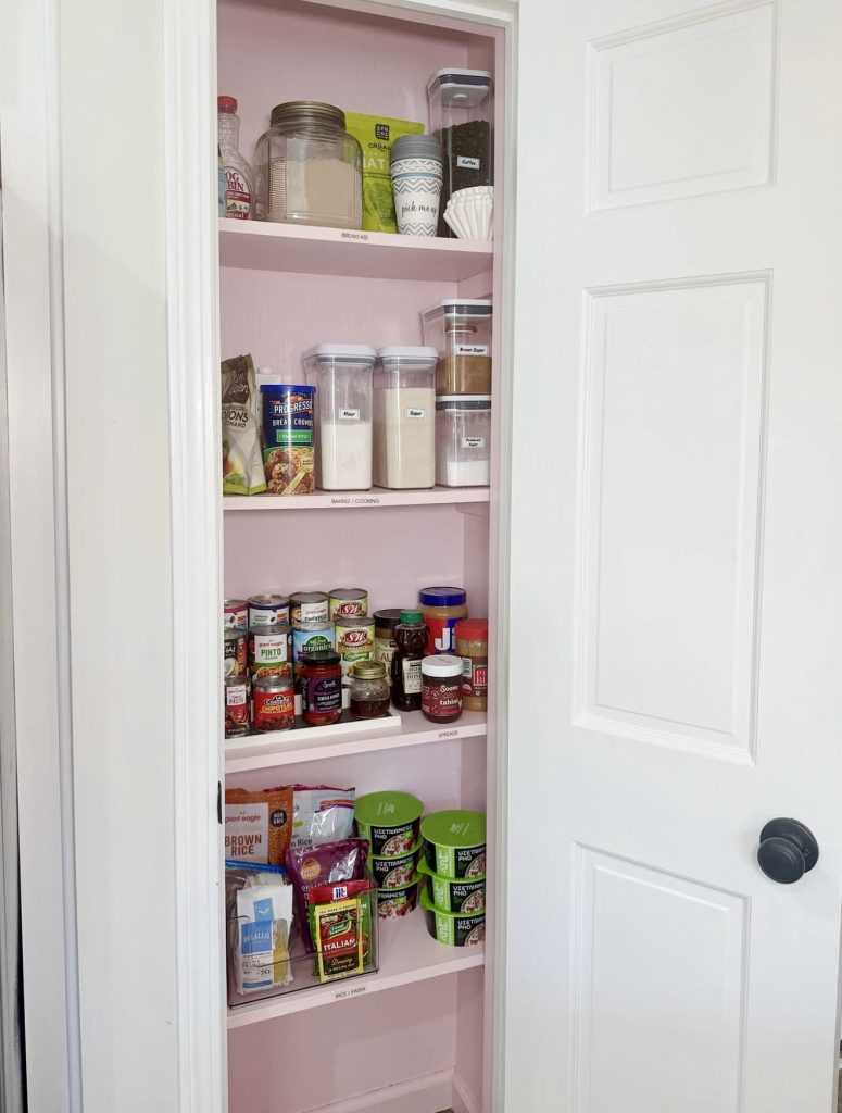 This pantry shows how color can instantly transform a small closet into a statement. Soft pink shelves make storage look cheerful, while labeled containers keep flour, sugar, and coffee neatly stacked. Even with limited depth, smart storage ideas like stacking jars and grouping cans make the space efficient. For anyone tackling a makeover diy, paint is one of the easiest ways to update a pantry.
