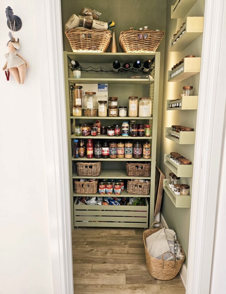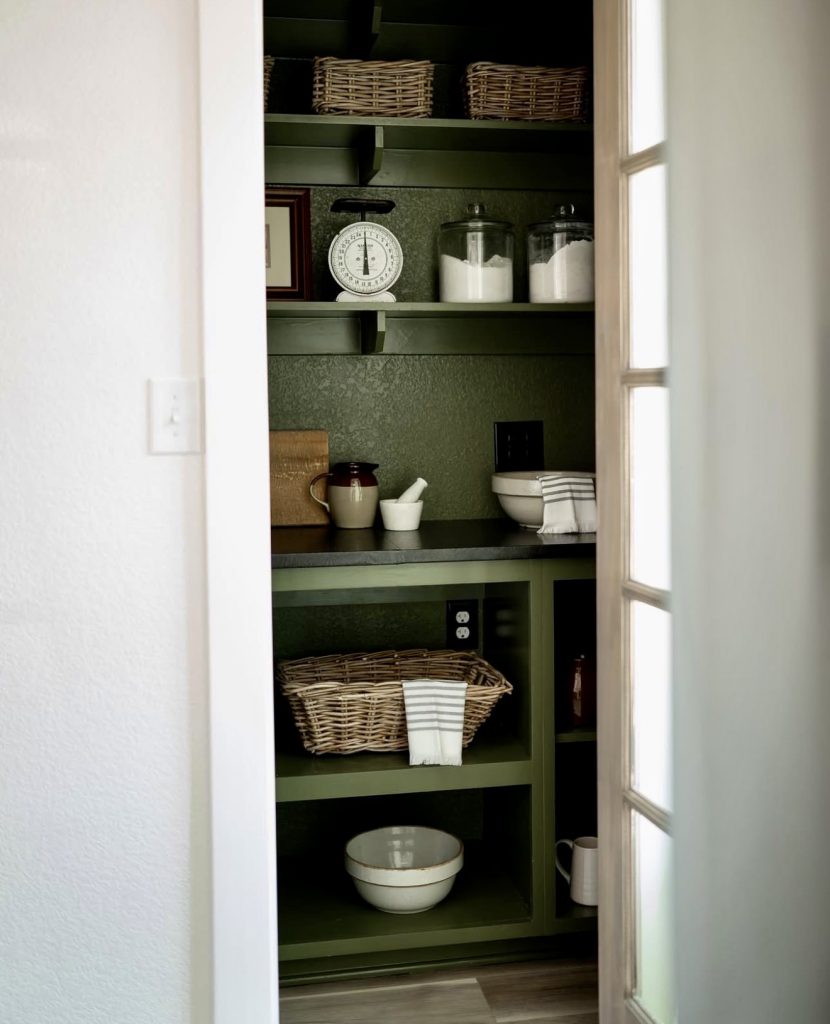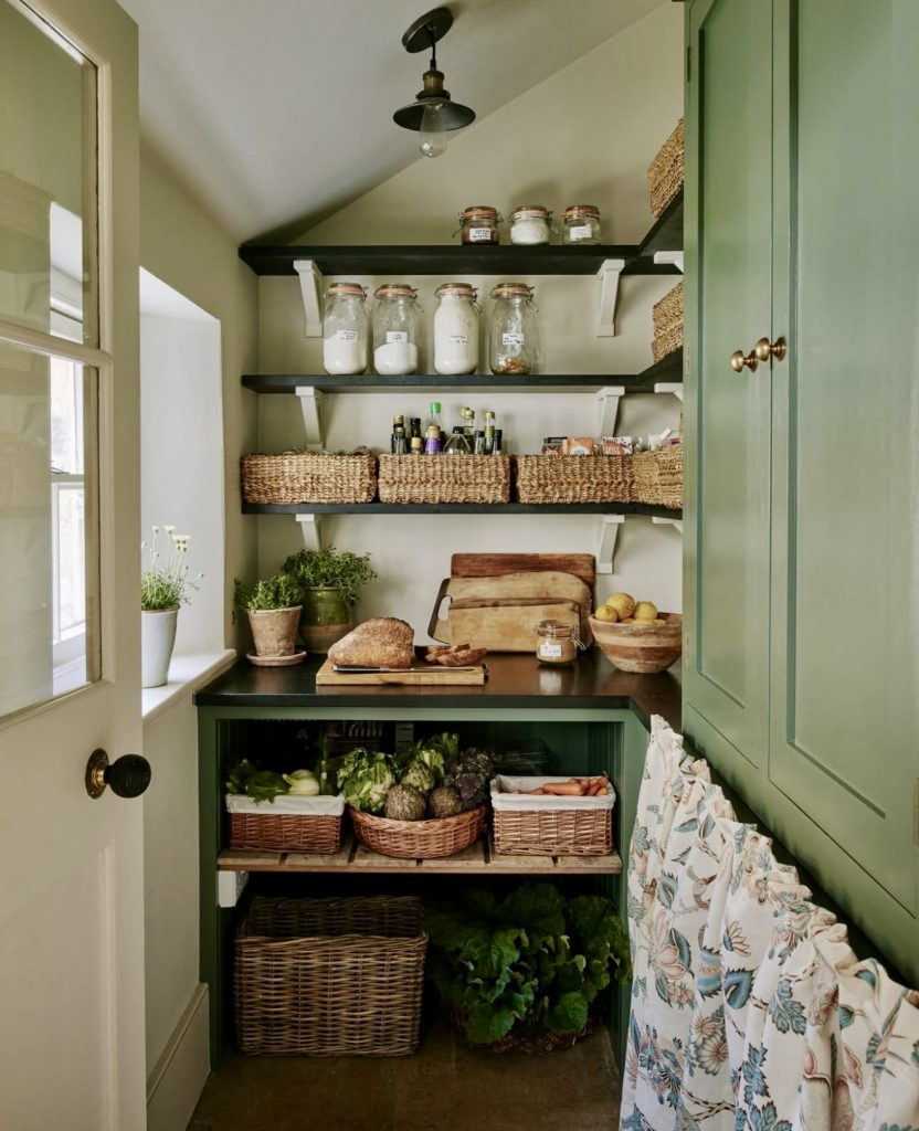 This cozy pantry relies on wicker baskets and green-painted shelves for a warm, cottage-inspired feel. Side racks provide extra space for spices, making the most of vertical storage. The thoughtful design ideas create a charming room that feels practical yet styled. It’s an inviting ideas layout that proves pantries don’t have to be hidden away—they can add to a home’s personality.