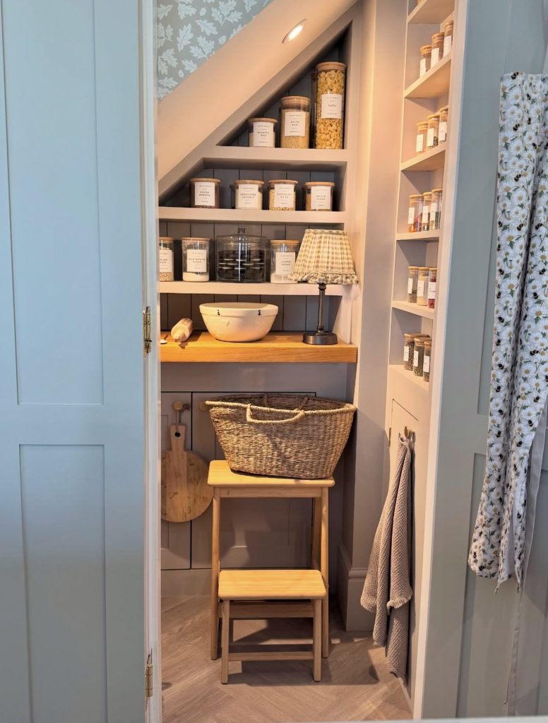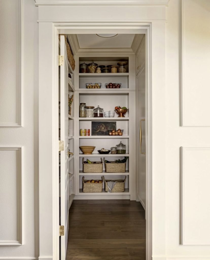 This tall and narrow pantry uses open shelving to keep jars, baskets, and bowls neatly displayed. The neutral tones allow food and storage containers to stand out, while the recessed design feels built into the home’s architecture. Woven baskets provide warmth and texture, making this an inviting closet design. It’s a simple but timeless organisation idea for small kitchens.