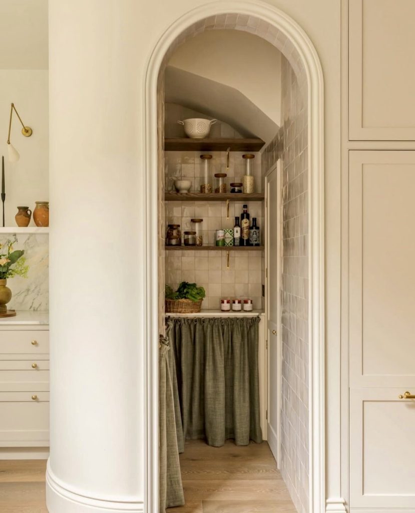 An elegant arched doorway frames this pantry, which combines tile walls with open shelving for a sophisticated look. The fabric skirt conceals lower storage, adding softness and practicality to the design layout. A mix of jars, bottles, and baskets keeps everything organized without feeling too rigid. This style blends classic closet design with modern charm, making it ideal for timeless interiors.