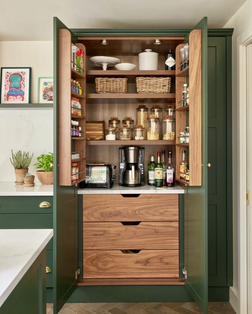 This pantry doubles as a hidden coffee station, showing how ideas closet designs can merge with everyday living. Dark green doors open to reveal warm wood shelving, woven baskets, and appliances, all neatly organized. The mix of drawers, shelves, and side racks creates a smart layout that uses every inch of space. It’s an inspiring remodel idea for those who want storage with personality.