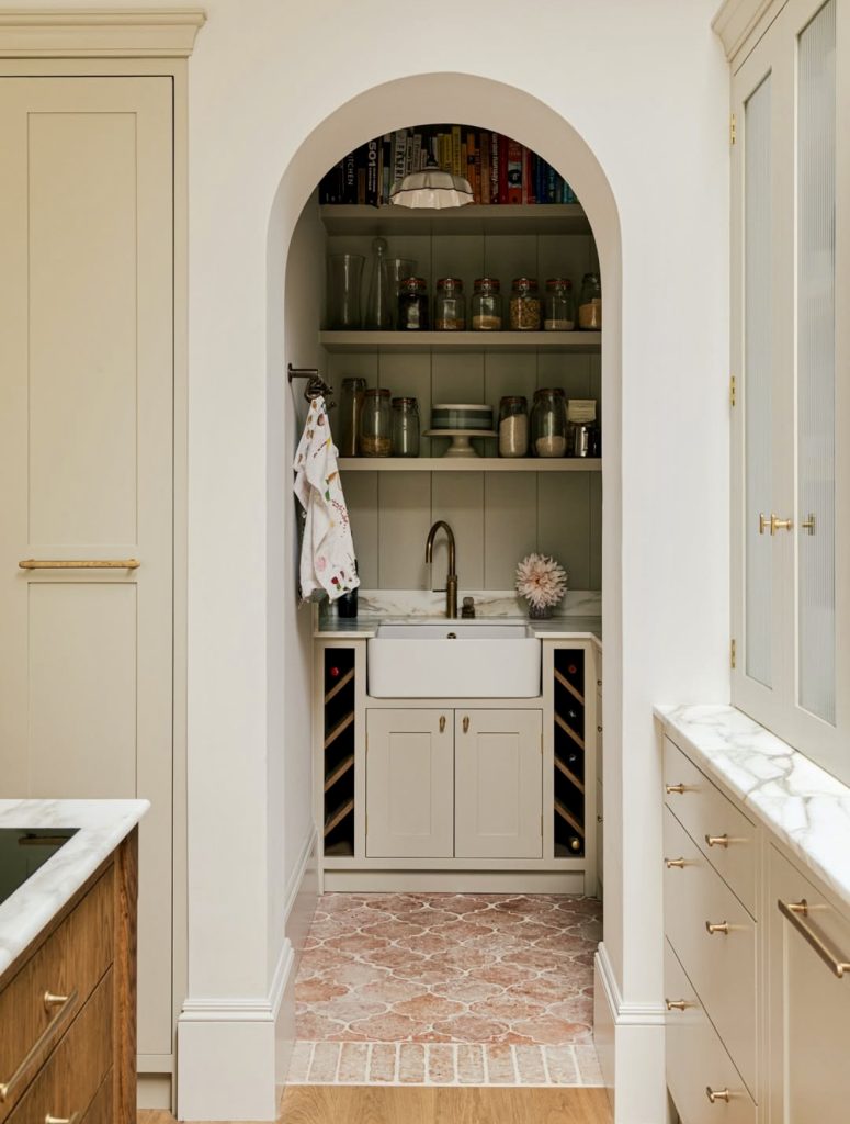 Here, an arched entrance leads to a pantry that feels like a small kitchen of its own. A farmhouse sink, marble countertop, and wine racks give the space extra versatility beyond just food storage. Open shelving ideas showcase jars and books, blending organisation with decorative style. This is a prime example of how thoughtful design ideas can turn a pantry into a multi-functional room.
