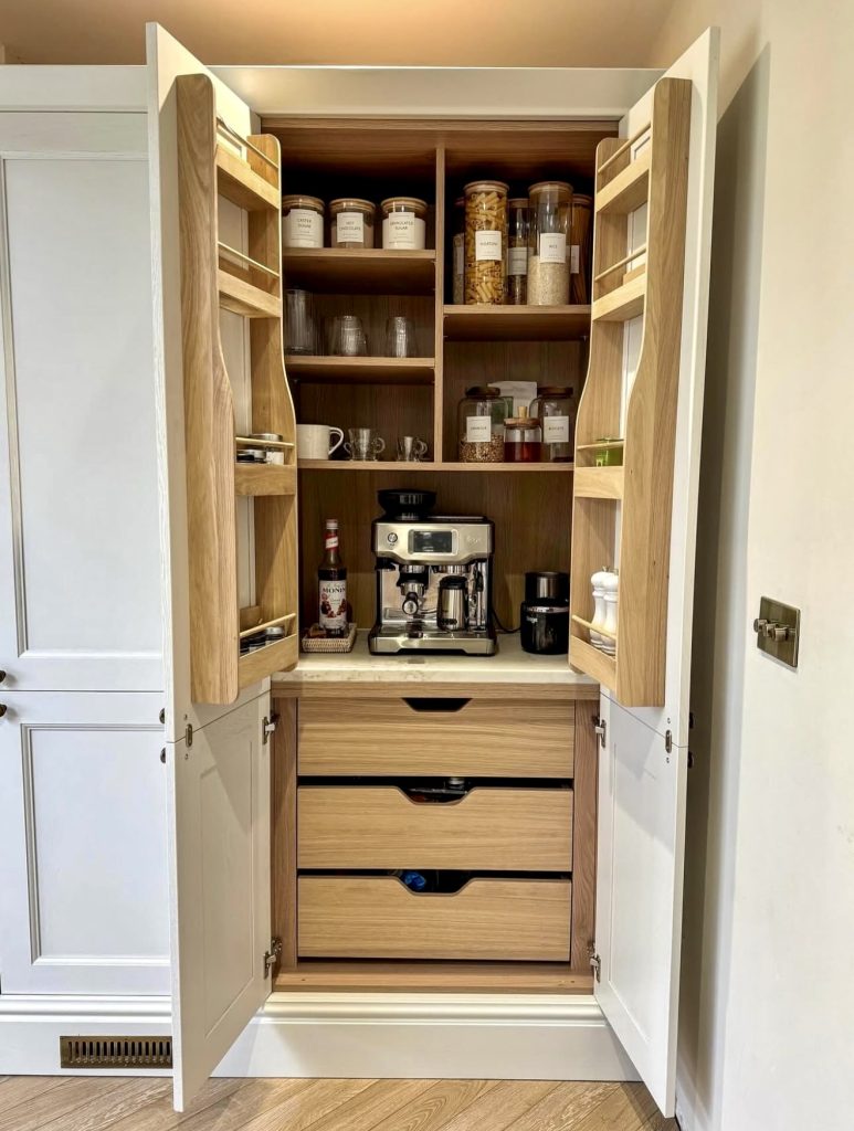 This cabinet pantry is designed for coffee lovers, with an espresso machine tucked beneath labeled jars and shelves. Wooden accents soften the look, while side door ideas add extra storage for spices and accessories. Pull-out drawers maximize organization ideas shelves and make it easy to access small items. It’s a smart design layout for those who want a beverage station without sacrificing space.