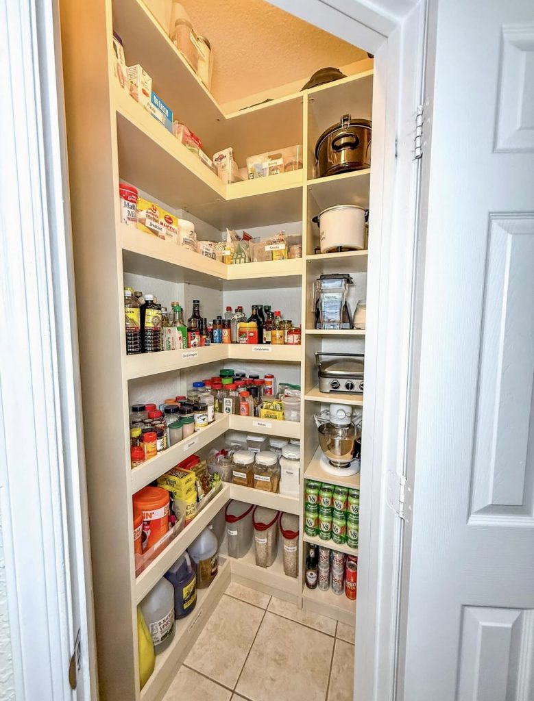 Here, every wall is used to its fullest, with shelving ideas wrapping around the entire pantry. Jars, bottles, and bins each have their own zone, showing how a thoughtful layout can keep even the busiest pantry under control. The labeled containers make it easy to organize and maintain order long-term. This design proves that efficient storage ideas can work in tight quarters.