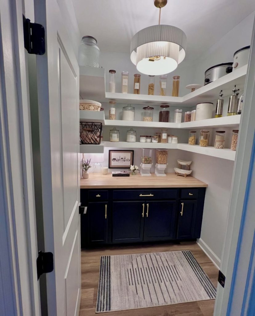 Deep navy cabinetry paired with a warm wood countertop makes this pantry both stylish and practical. Glass jars line floating shelves, showing how clear containers can double as décor and organization. The thoughtful design layout includes a rug and pendant light, making the space feel like a true extension of the kitchen. It’s a perfect blend of remodel ideas and modern charm.