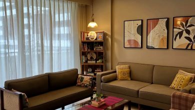 The living room is a perfect example of the combination of warmth and coziness with grace and sophisticated design, with the soft lighting, plush textures, and well arranged. Section sofa calls for leisure and a geometric-patterned rug and a round coffee table complement space with depth. The soft candlelight and the gentle touch of pampas grass have charming the space with an intimate atmosphere which gives an idea to those who think of a luxury retreat hinting boho. The use of soft neutrals along with textured materials guarantees that the place is still fashionable and approachable.