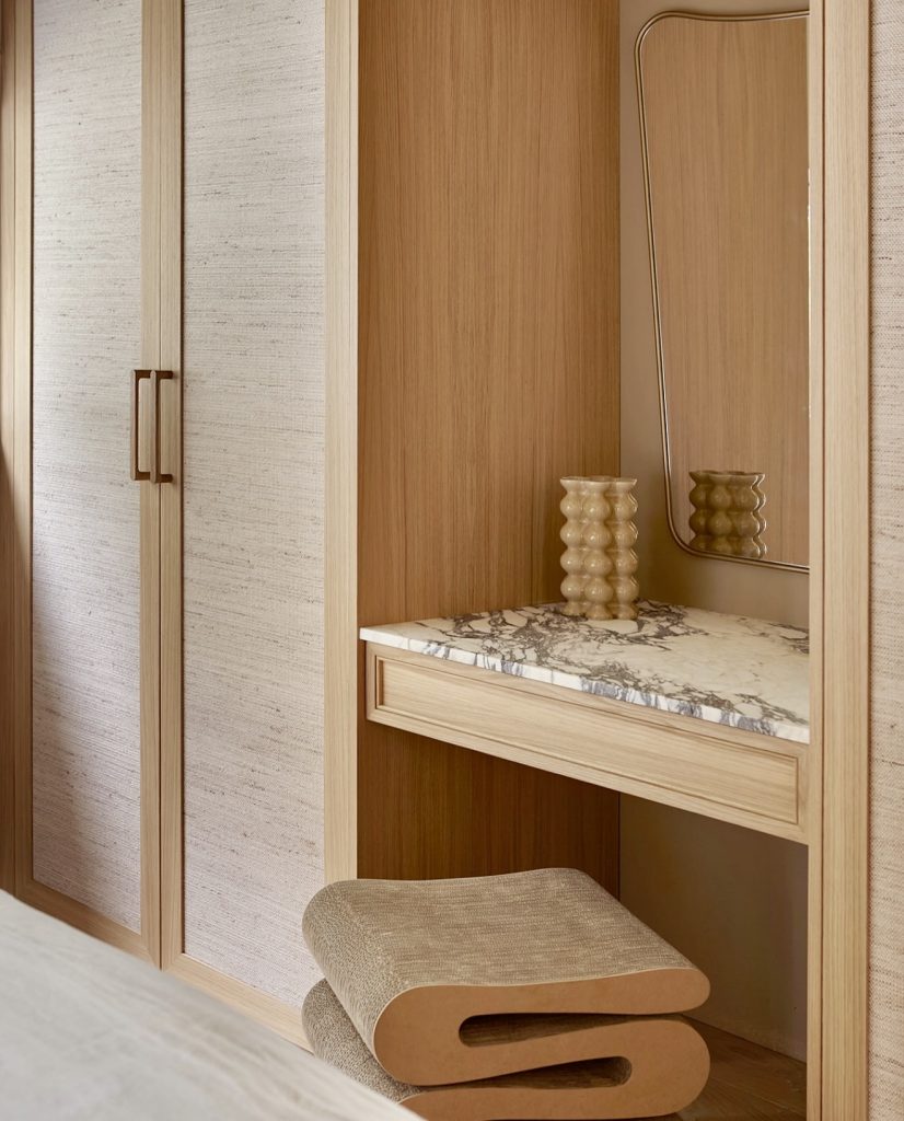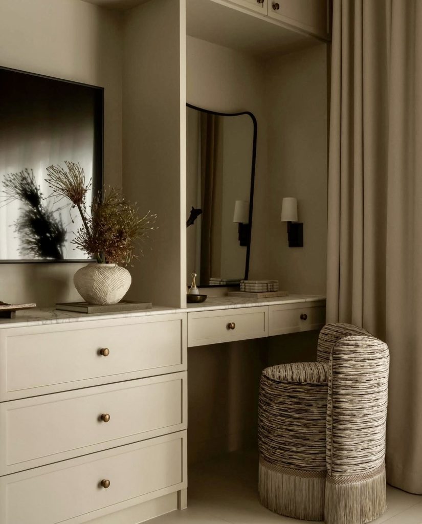 Vanities are built into the walls, allowing spaces to remain open for the rest of the room. This built-in vanity blends soft neutrals, warm lighting, and refined details to create an elegant and subtly modern look that fits seamlessly into any bedroom layout. The creamy cabinetry gives the space a sense of quiet aesthetic calm, while the sculptural chair introduces tactile charm reminiscent of light bohemian influences. Its discreet drawers offer practical organization, making it ideal for a small room where every inch matters. The understated styling, from the curved mirror to the minimal tabletop decor, makes this vanity a timeless choice for homeowners who prefer understated luxury without sacrificing functionality.