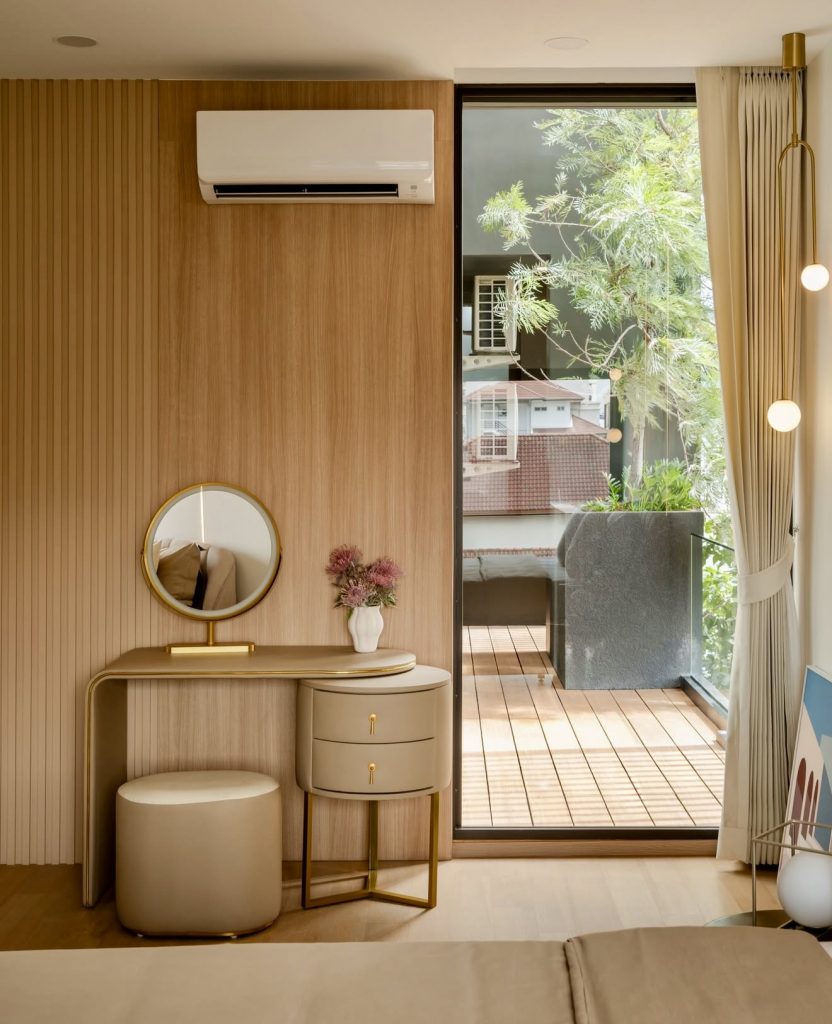 This vanity brings a warm, sculptural beauty to the bedroom through its soft curves, matte gold edging, and rounded drawers that feel both elegant and unmistakably like modern luxury. The compact scale makes it ideal for small spaces, while the monochromatic palette keeps the room calm and cohesive. Its gentle, flowing form adds a sense of softness that contrasts beautifully with the vertical wood paneling behind it, creating a corner that feels intentional and serene. Paired with a simple round mirror and a matching cushioned stool, this vanity becomes a welcoming spot for a morning makeup ritual or a quiet end-of-day unwind.