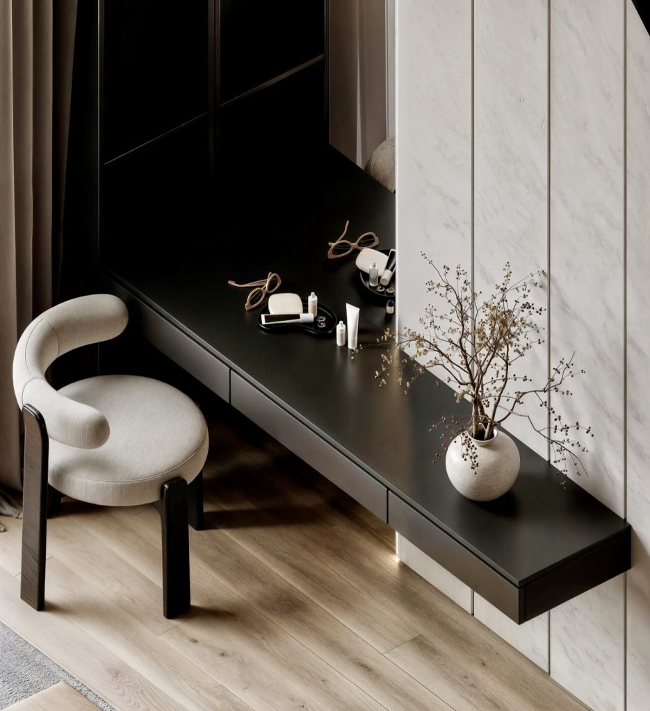 This sleek vanity brings together matte black surfaces and soft wood detailing, creating a sophisticated corner that feels balanced and grounded. Ideal for homeowners who appreciate a cleaner, modern aesthetic, the floating desk design keeps the floor open and uncluttered—a smart choice for small rooms. The simple decorative pieces add quiet warmth without disrupting the minimal look, and the overall feel is calm, organized, and purposefully understated. It’s the kind of vanity that appeals to those who want an elevated space without unnecessary embellishment.