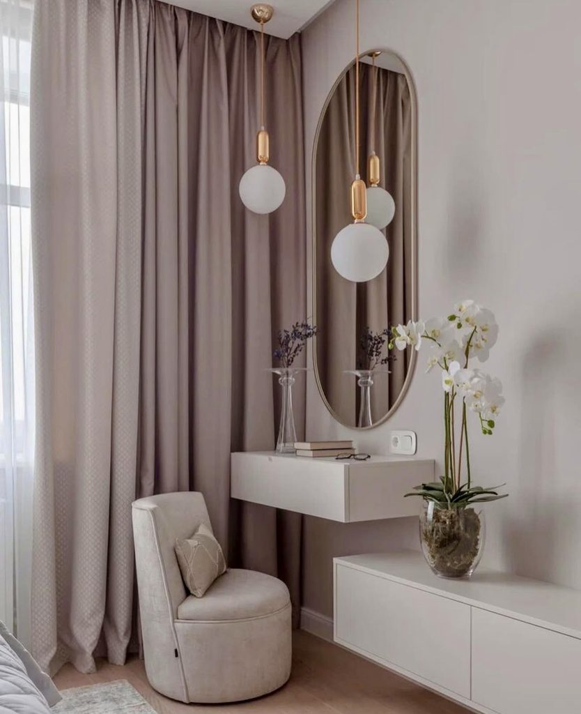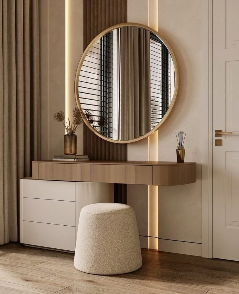 This beautifully layered vanity blends soft neutrals with touches of gold, creating a quietly elegant corner ideal for calming morning rituals. The floating desk design maximizes space—particularly helpful in small rooms—while the tall oval mirror paired with pendant lighting adds a luxe, boutique-like ambiance. The plush, rounded chair reinforces comfort without sacrificing style, and the clean-lined drawers provide smart organization for daily makeup essentials. Overall, this setup captures the kind of refined, classy simplicity many homeowners seek in 2026.