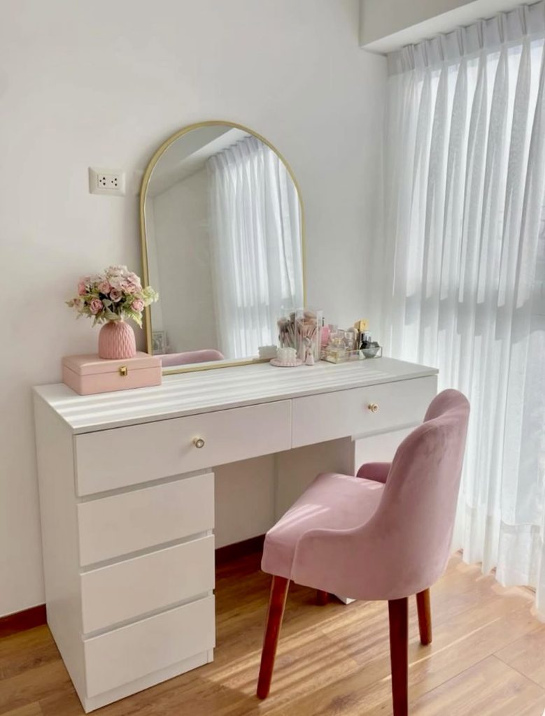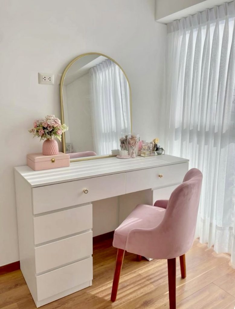 This bright and feminine vanity setup is perfect for someone who loves a touch of pink charm without overwhelming the space. The clean white desk feels inspired by approachable Ikea simplicity, making it a smart fit for apartments and small spaces where versatility is essential. The blush velvet chair adds a classy and inviting feel—just the kind of detail that transforms a simple desk into a full beauty corner. With its arched mirror and gentle natural light, this design makes the everyday makeup routine feel uplifting and calming, offering both practicality and soft, welcoming style.