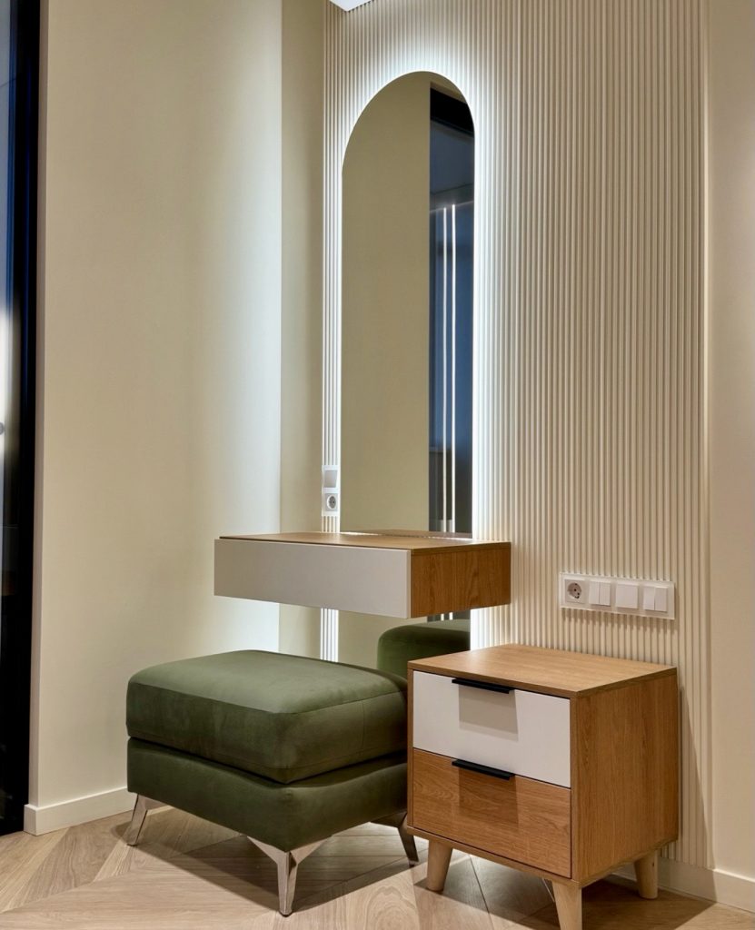 This distinctive setup brings a playful yet polished energy, anchored by an arched backlit mirror that immediately sets a modern luxury tone. The combination of warm wood accents and the deep green ottoman gives the vanity a fresh, contemporary feel while maintaining a sense of comfort. Ideal for those with small spaces, the floating drawer keeps the floor clear and emphasizes good organization, making the entire corner feel curated rather than cluttered. It’s the kind of design that blends approachable everyday living with high-end visual interest, perfect for homeowners who appreciate thoughtful detail.