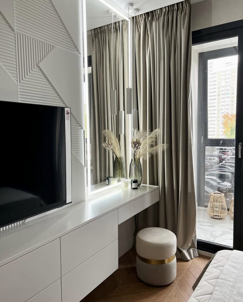 This vanity embraces contemporary elegance with its illuminated mirror, sleek white cabinetry, and luxuriously soft stool featuring a gold accent band. The lighting design creates an unmistakable sense of modern luxury, making this setup feel like a boutique dressing area even in small spaces. Taupe curtains and dried botanical decor add warmth and contrast, balancing the clean-lined furniture. The floating layout and integrated drawers make organization easy, while the overall aesthetic appeals to homeowners who favor understated sophistication with a hint of softness.