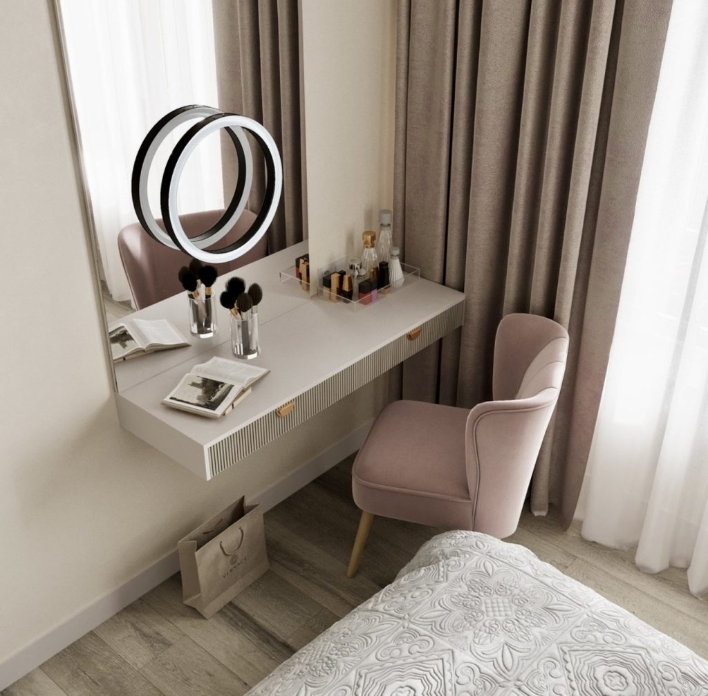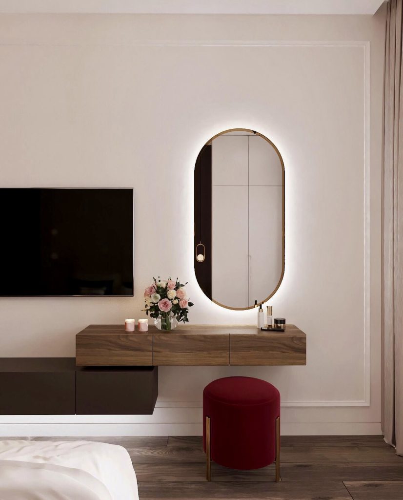 Pairing a floating vanity with a sculptural LED mirror, this design creates a visually striking yet feminine beauty corner—perfect for those who love a soft, pink, aesthetic interior. The blush chair adds warmth and comfort, while the ribbed detailing beneath the tabletop enhances the vanity’s modern charm. Compact enough for small spaces, it offers practical organization for daily makeup essentials without crowding the room. Its blend of light textures, minimalist lighting, and curated accessories makes it a wonderful example of how functional design can still feel expressive and beautifully personal.