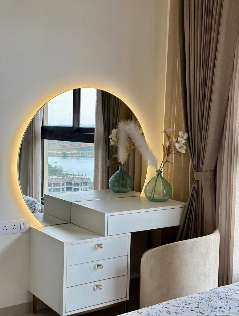 This vanity feels effortlessly serene, thanks to its glowing round mirror that creates a soft halo effect—instantly adding a touch of modern luxury without overwhelming the room. The clean-lined white drawers provide functional organization, while the curved chair maintains a warm, inviting aesthetic. Subtle decorative elements, like the delicate dried florals in green-tinted vases, introduce a whisper of natural calm. This setup excels in small spaces, making the morning makeup routine feel relaxed and intentional, all while framing a stunning view outside the window.