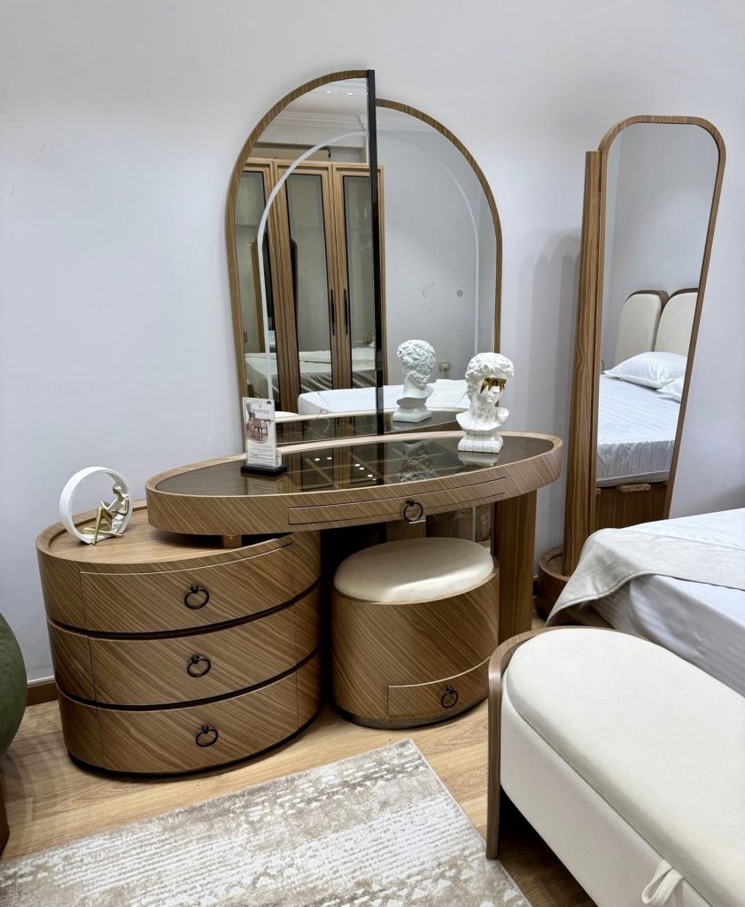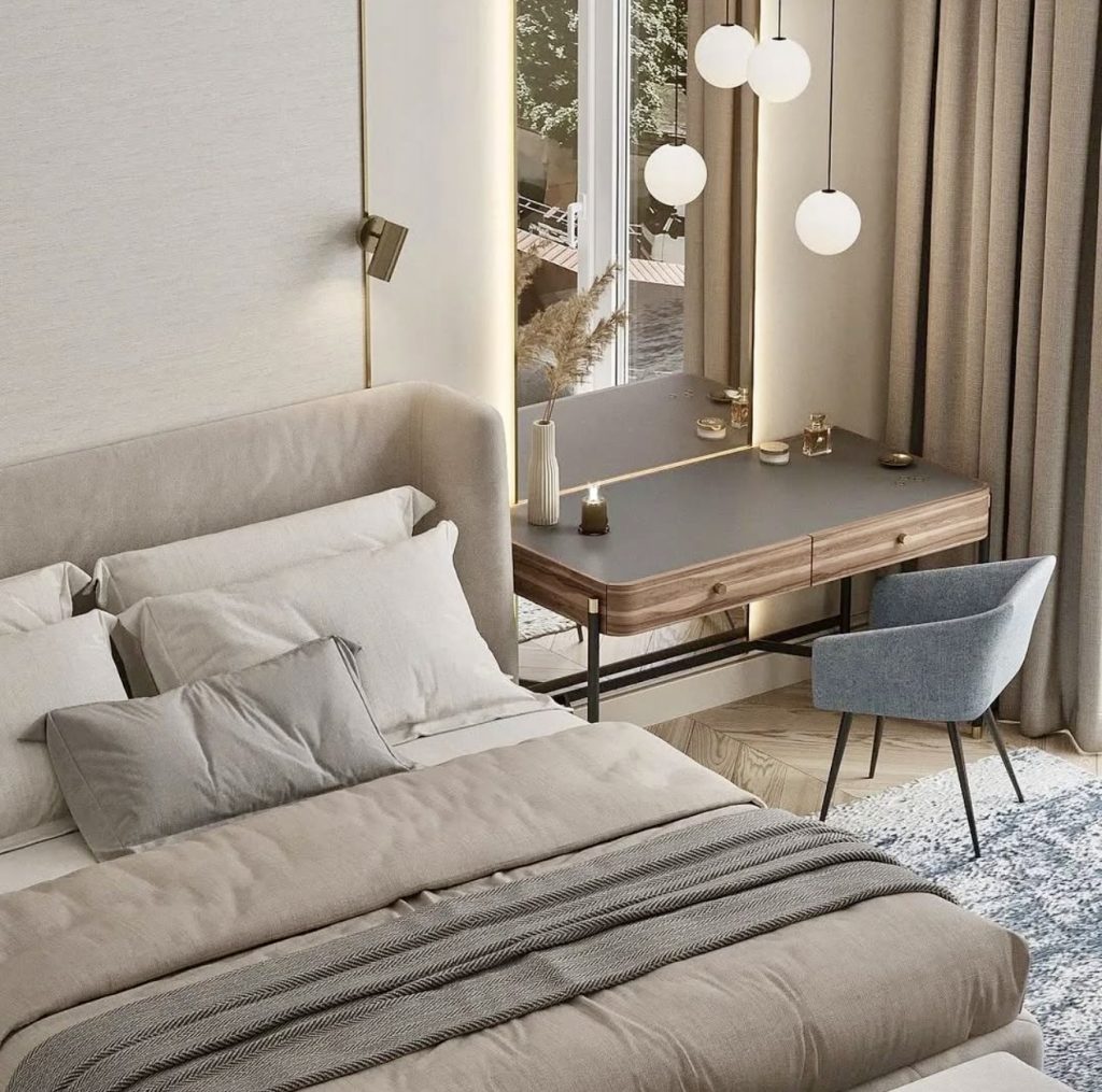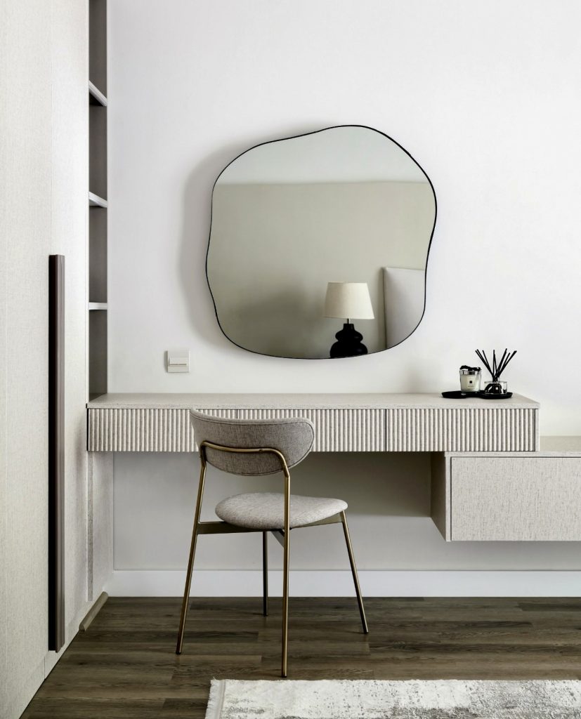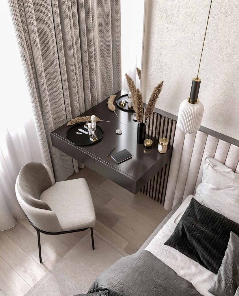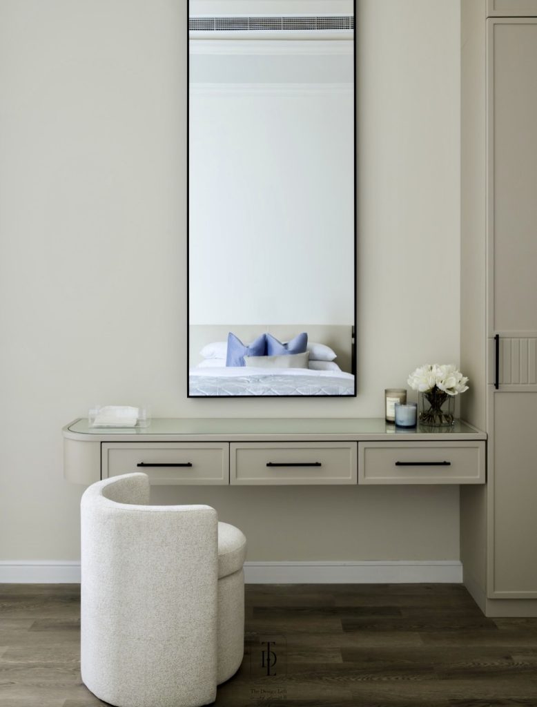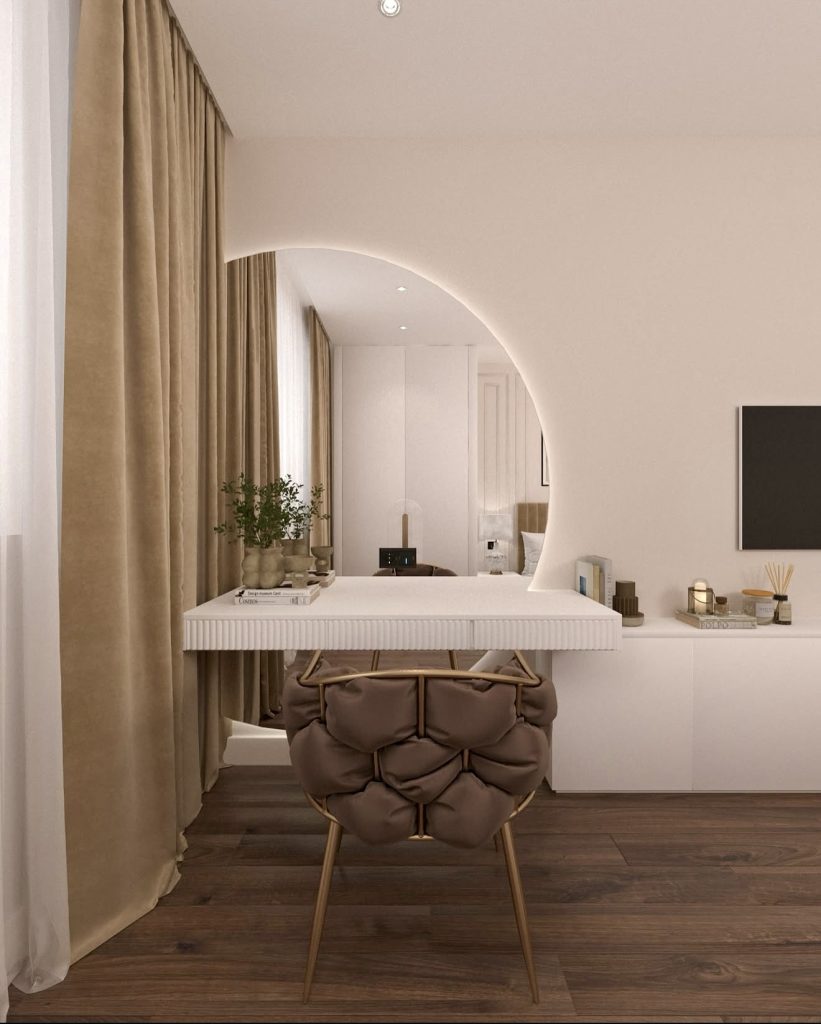 This beautifully understated vanity brings a quiet sense of modern luxury to the bedroom, thanks to its smooth floating design and the dramatic oversized mirror that visually expands the entire corner. The curved boucle chair adds a soft tactile presence without overwhelming the space, making it an excellent fit for a small room where comfort and elegance must coexist. The soft beige palette feels soothing and intentionally simple, allowing the vanity to function as both a daily makeup station and a subtle design statement. With clean lines and thoughtful organization, this setup reflects the type of calm, clutter-free aesthetic many homeowners seek today.