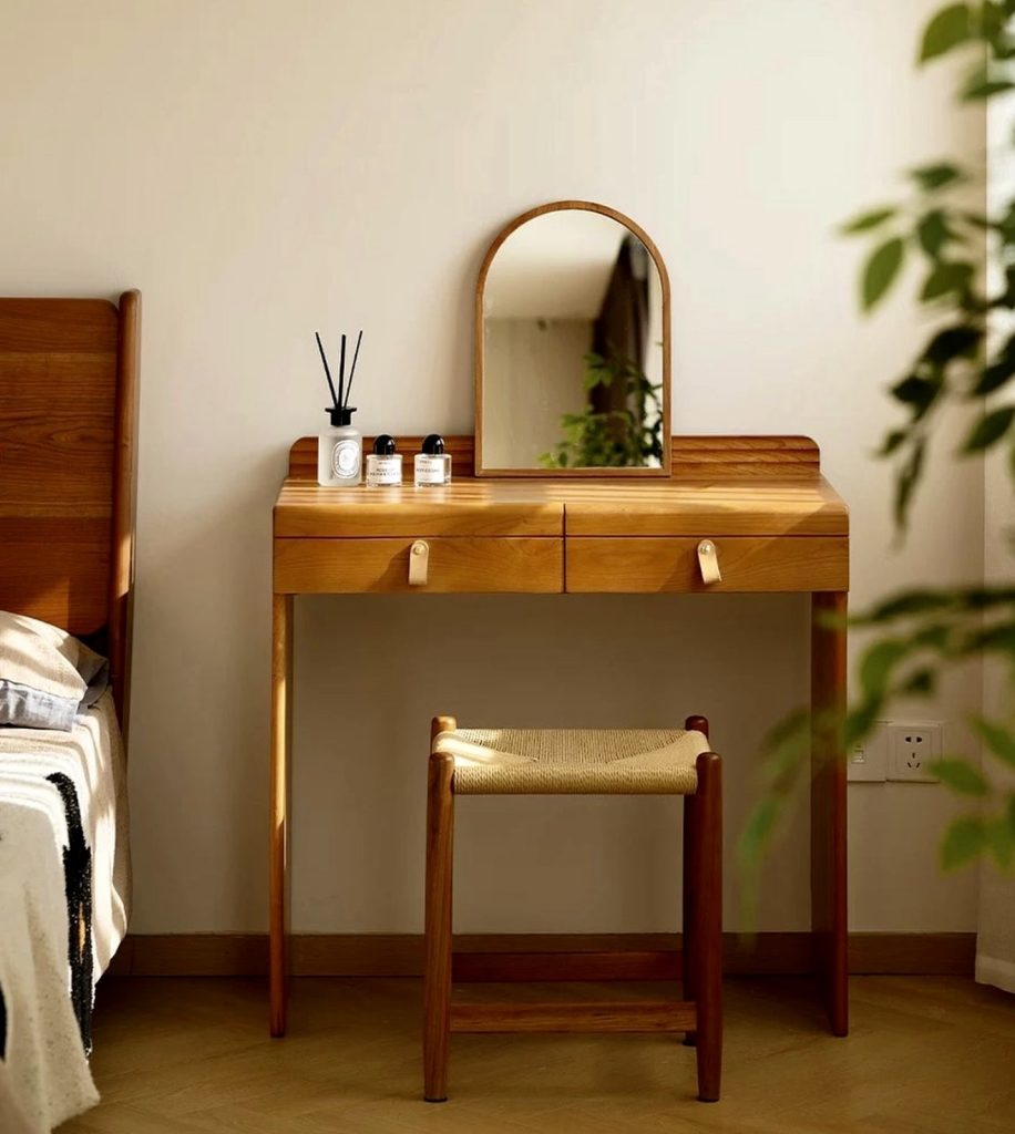 This charming vanity embraces the beauty of natural wood, offering a timeless look that feels grounded and welcoming. The small arched mirror and woven stool bring in subtle rustic and vintage influences, making the space perfect for someone who values simplicity and craftsmanship. Without relying on bold colors or elaborate styling, this design shines through warm sunlight, clean lines, and practical organization. It’s a lovely reminder that a vanity can feel stylish and personal even in the most pared-back small room layouts.