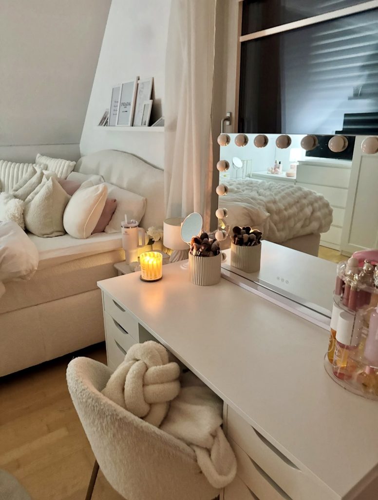 This inviting setup captures everything people love about warm, cozy bedrooms—soft lighting, comfortable seating, and thoughtful organization. The glowing bulbs around the mirror nod to classic Hollywood glam, while the creamy fabrics and plush blanket draped over the chair evoke a snug, homey feel. Perfect for a small room, this vanity combines practicality with comfort, offering space for small makeup essentials without sacrificing style. The overall mood is charming and deeply personal, making it ideal for anyone who enjoys winding down with a quiet self-care routine at the end of the day.