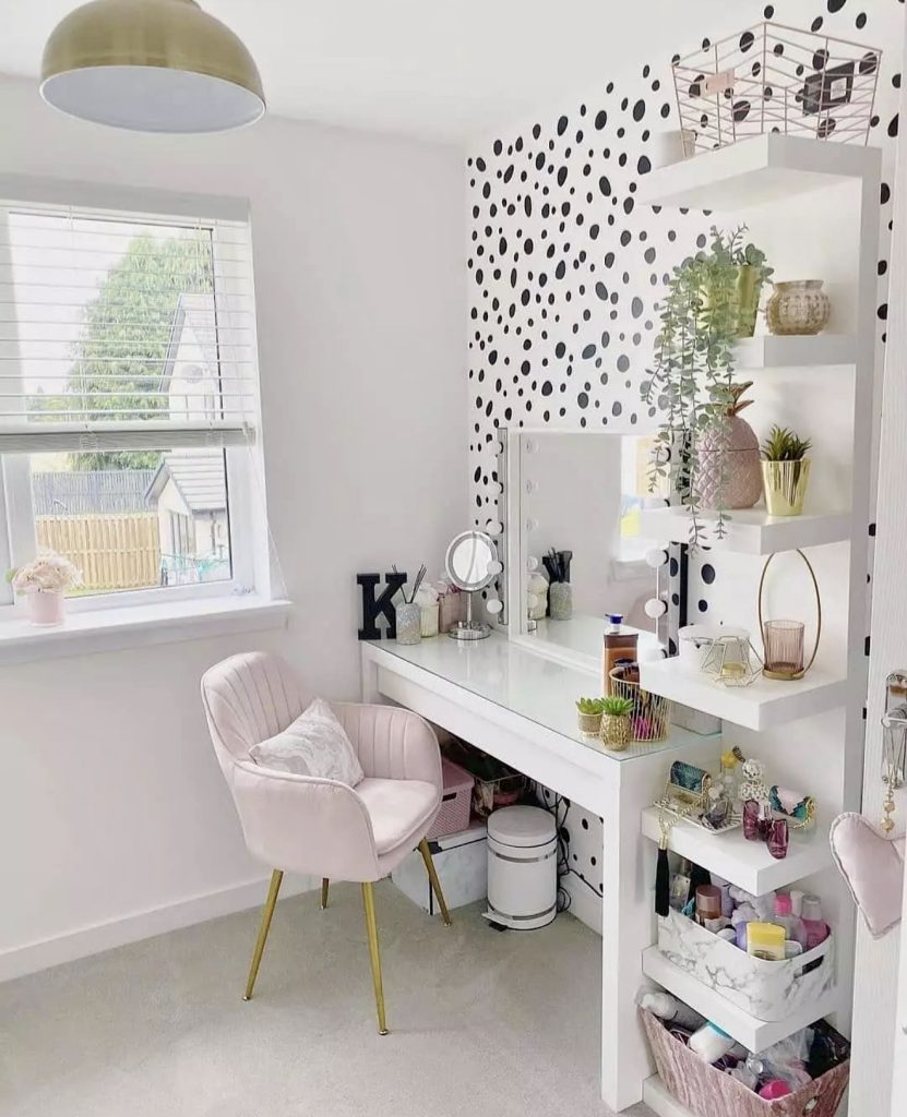 This cheerful vanity setup brings a fun, youthful twist to bedroom styling with its black-and-white dotted feature wall and fresh white shelving that boosts everyday organization. The blush chair with gold legs adds a pink, feminine charm, while the accessible open storage supports plenty of small makeup essentials—perfect for someone who loves a lively, aesthetic preppy feel. Inspired by an approachable DIY spirit, the layout makes smart use of small spaces, creating a dedicated beauty corner that feels personal and uplifting. It’s the kind of design young adults often reference from Pinterest or Bloxburg boards because it balances whimsy with real-world function.
