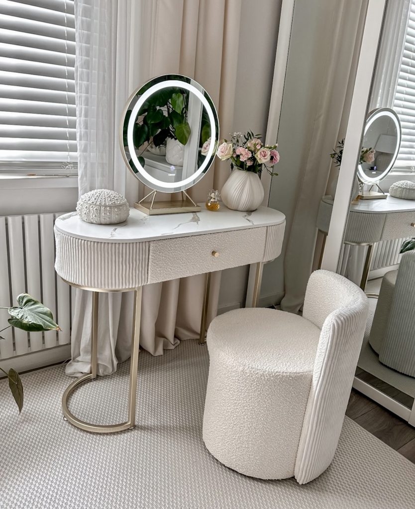 Soft, rounded forms define this calming vanity, where a delicate blend of warm neutrals and subtle gold details create a truly elegant and serene beauty nook. The LED mirror provides flawless lighting for makeup application, while the boucle-style chair enhances both comfort and texture. Its small footprint works beautifully in a small room, proving that thoughtful materials and sleek lines can make even compact setups feel refined. The ribbed detailing and marble-inspired surface nod to high-end boutique styling—a perfect blend of cozy minimalism and classy sophistication that’s trending heavily across U.S. interiors right now.