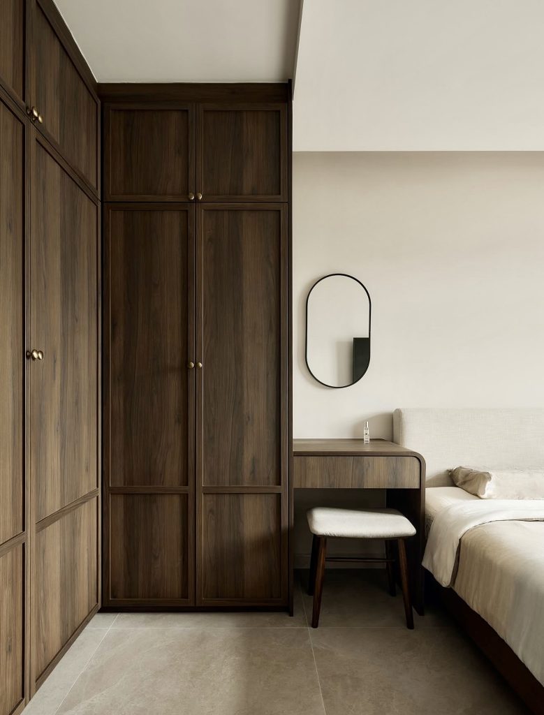 This compact vanity is made from rich dark wood cabinetry. This instantly evokes the feeling of additional warmth and quiet confidence in the room. The stool and small oval mirror add to the minimalism of the vanity, suiting the taste of homeowners who appreciate minimalism. The palette is subtly rustic yet is predominantly modern, appealing to the desires of people looking for timelessness. This vanity fits perfectly in small spaces, as it has the ability to integrate into the wardrobe, showcasing that a built-in vanity can be efficient and designed with intention.