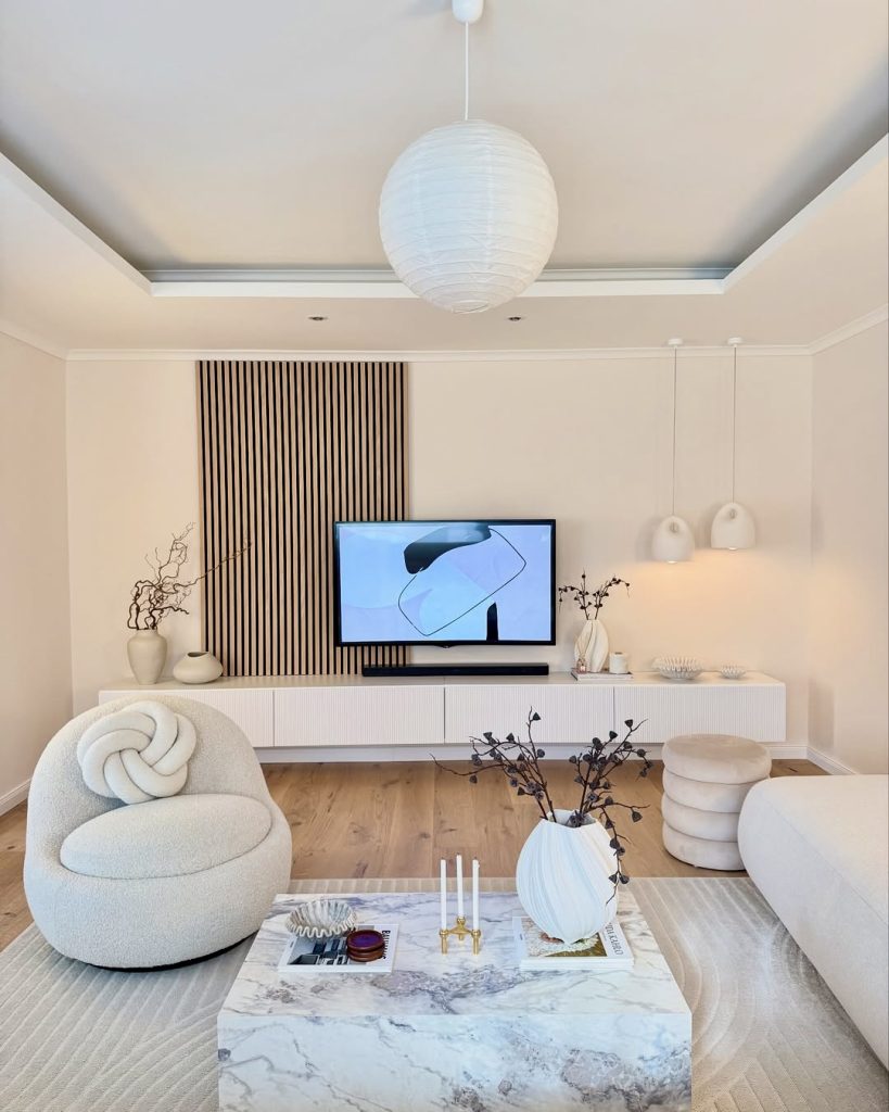 We are presented with a contemporary minimalist approach that delivers soft sculptural details. A gorgeous veined marble coffee table is the focal point of this cream-colored space. The combination of the knotted boucle accent chair and organic branches placed in sculptural vases keeps the room from feeling rigid. A wood slat pattern installed vertically behind the TV creates visual warmth that softens the room’s predominantly cool color scheme. This room has a modern black and white combination that provides refinement rather than harshness.