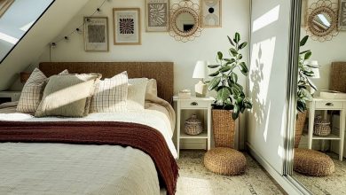 Natural light pours into a refreshing bedroom that combines soothing green textiles with earthy accents. A small potted plant and woven textures add a touch of nature’s calm, demonstrating how simple green additions can transform a small space into a cozy sanctuary. This bedroom is a nod to easy living and aesthetic appeal, with a casual yet polished feel.