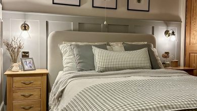 This bedroom strikes a harmonious balance with its soothing grey paneling and the green accent wall above. The earth-toned furnishings complement the white bedding, creating a color scheme that’s both sophisticated and easy to love. This space speaks to those yearning for a small retreat from the hustle and bustle, providing a unique and tranquil environment for relaxation.