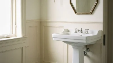 Here, a vintage wooden table repurposed as a sink console breathes life into the concept of small kitchen ideas adapted for the bathroom. The under-table baskets, a rustic nod to Dollar tree finds, are not just decorative but serve as practical storage for fluffy towels and toiletries. The elegance of the past meets the 2025 sensibilities of design and organization, creating a harmonious blend of form and function.