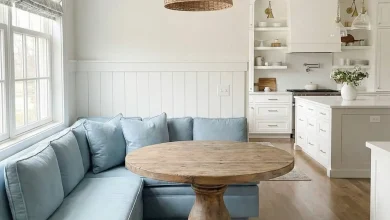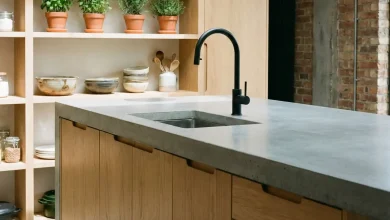 As sunlight pours through expansive windows, it catches the honeyed hues of the wooden cabinetry, giving the entire room a golden glow. The concrete countertops are a grounded touch, adding durability to the visual softness. This kitchen idea offers a perfect nook for a blueberry-laden breakfast, as the blue and natural elements come together to start the day with a quiet energy.