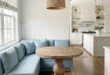 In this space, the rustic beige and wooden panels blend seamlessly with modern comforts. The wicker chairs and the grand chandelier add layers of texture, bringing a countryside charm into an urban home. Here, the island becomes more than a mere workstation; it’s a gathering spot for families, an anchor in the gentle stream of day-to-day life.