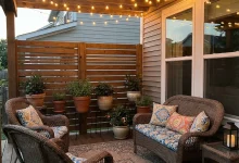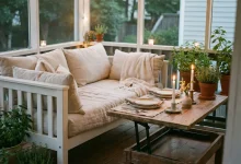 The first design transports us to a serene setting where the light wooden accents create a symbiotic relationship with the white surfaces. A mature olive tree stands proudly as a testament to the integration of the natural within the urban. Underneath, the sleek black and natural stools invite conversation and morning coffee. This space epitomizes the marriage between modernity and the timeless elegance of nature.