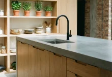 As sunlight pours through expansive windows, it catches the honeyed hues of the wooden cabinetry, giving the entire room a golden glow. The concrete countertops are a grounded touch, adding durability to the visual softness. This kitchen idea offers a perfect nook for a blueberry-laden breakfast, as the blue and natural elements come together to start the day with a quiet energy.