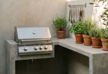 This living room is a celebration of texture and form. The rug’s bold colors bring a playful energy to the room, while the sculptural light fixture adds a futuristic touch. The backdrop of vertical lines on the wall enhances the room’s height, embodying the modern corner concept of blending art with functionality.